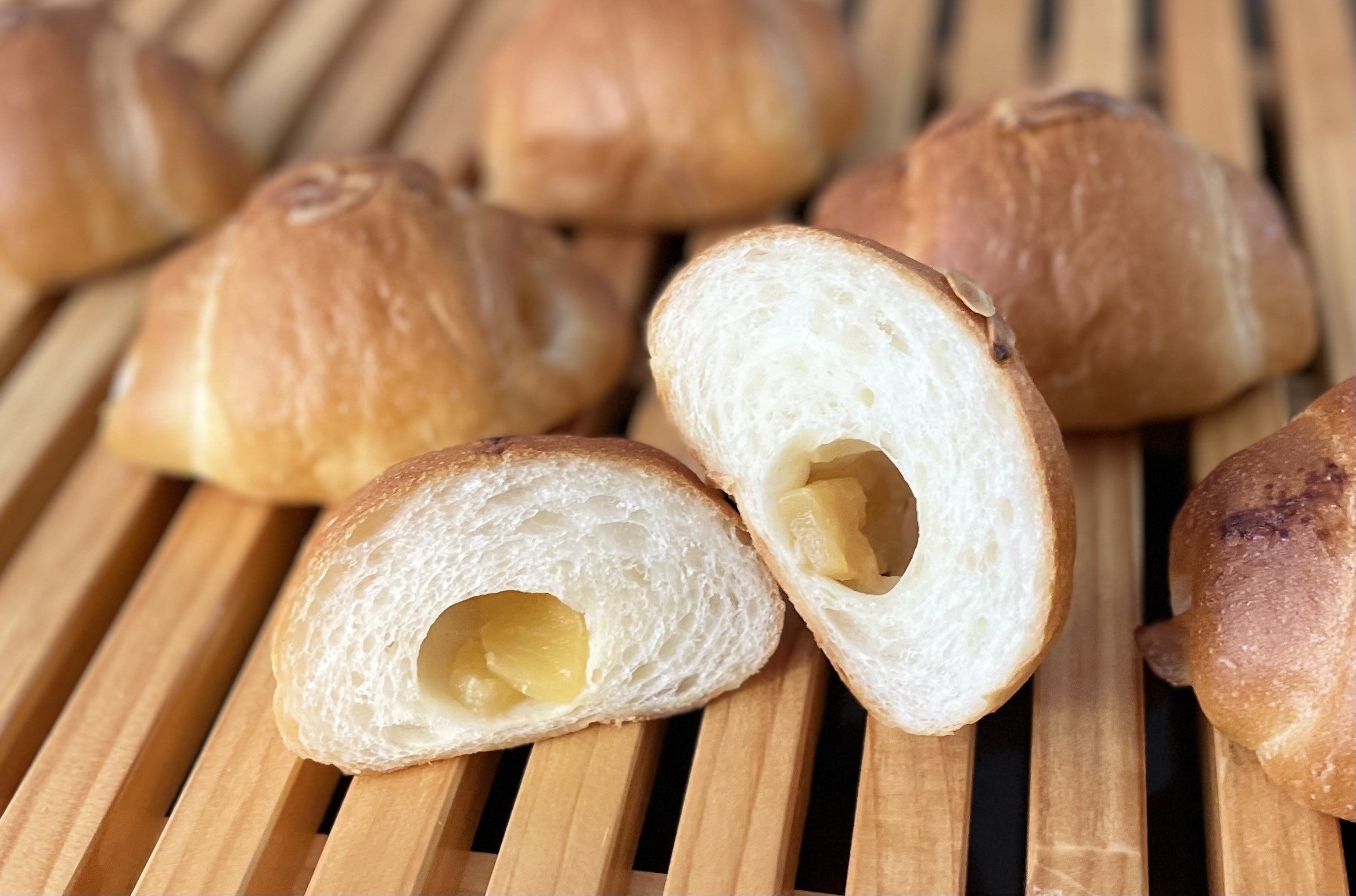 小麦粉を熱湯でα化し低温でじっくり熟成させるPasco独自の「超熟製法」で、もっちり、しっとりとした食感に焼き上げました。