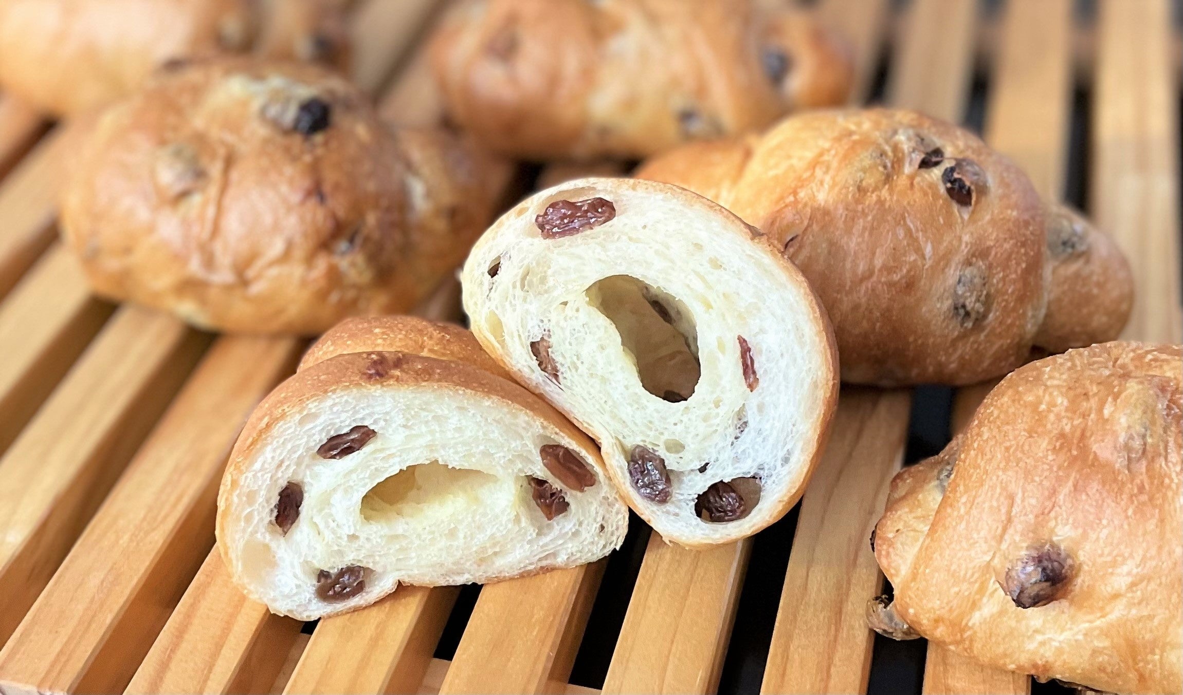 カリフォルニア産レーズンを練り込み焼き上げました。レーズンの甘酸っぱさと塩パンの塩味がクセになる味わいです。