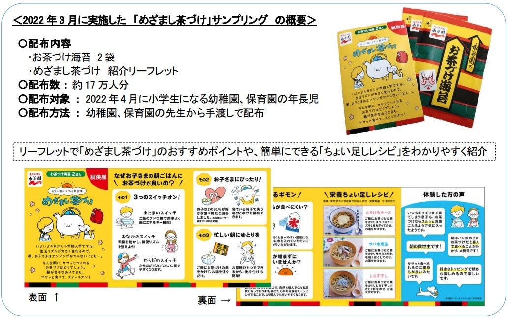 株式会社 永谷園(社長:成田 健一、東京都港区)は、2022年4月に小学校に入学する幼稚園・保育園の年長児17万人を対象に、「お茶づけ海苔」のサンプリングを同年3月に実施いたしました。