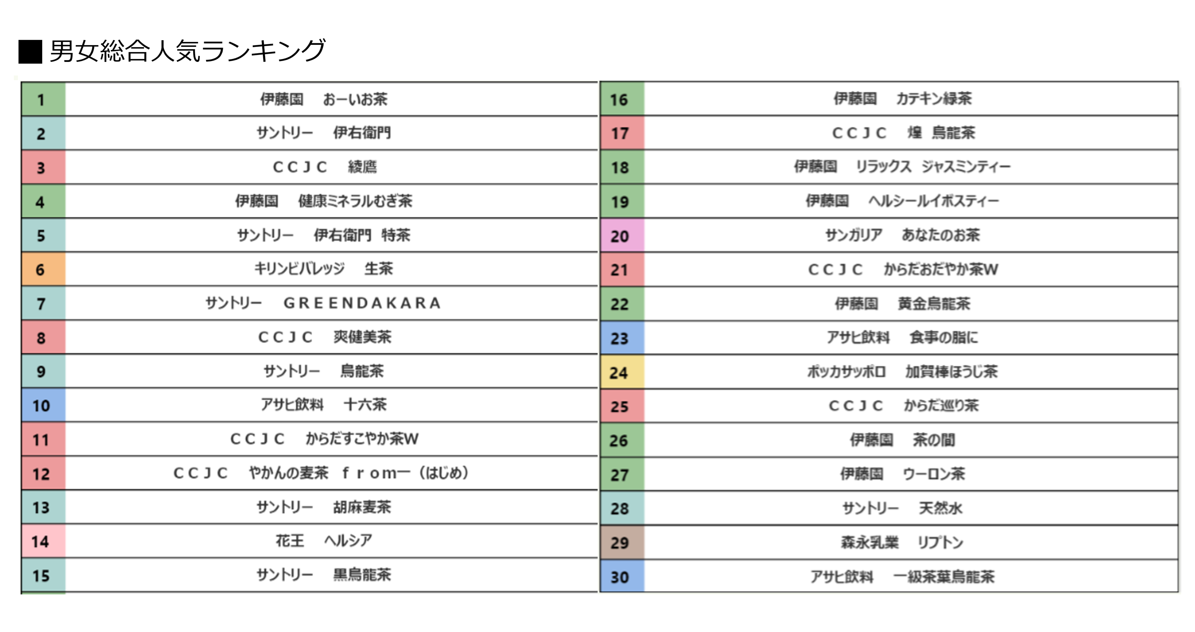 - 【男女総合・購買ランキング】無糖茶の総合ランキング(TOP30)