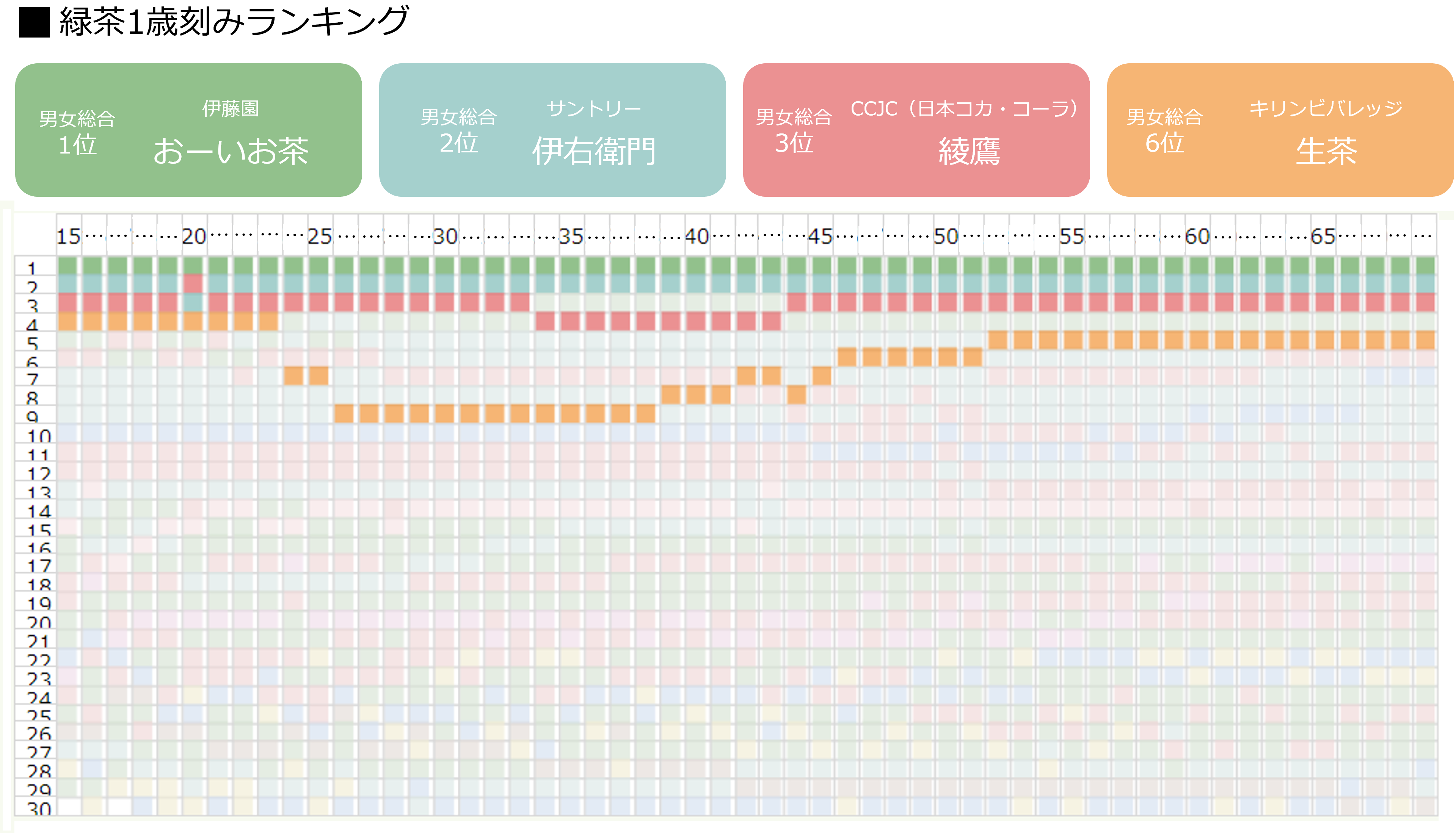 前述の通り、総合ランキングのトップ3は、1位が伊藤園「おーいお茶」、2位がサントリー「伊右衛門」、3位がCCJC(日本コカ・コーラ)「綾鷹」で、年齢によるランキング推移はほとんどありません。日常的に飲む緑茶は、それぞれ自分の好みに合わせて購入していることも考えられます。
