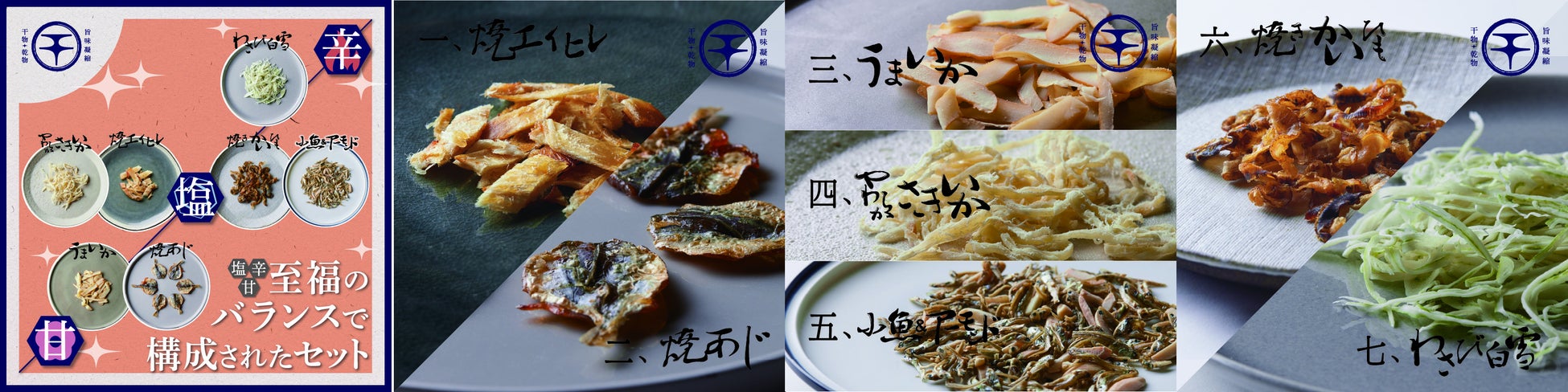 旨みと香ばしさが凝縮しエイヒレ本来の食感も楽しめる「①焼エイヒレ」、ほんのり甘めの味付けがクセになる「②焼あじ」、豊かな香りと柔らかさがちょっとしたご馳走感も醸し出す「③うまいか」、噛むほどにイカの旨みが口いっぱいに広がる 「④やわらかさきいか」、小魚の程よく甘い味付けとアーモンドの塩気が好相性の「⑤小魚アーモンド」、コリコリした食感と豊かな貝の旨みが堪能できる珍味「⑥焼きかいひも」、魚のすり身とわかめを混ぜ合わせピリッと山葵風味を効かせた 「⑦わさび白雪」。いずれも、食べ飽きないお酒のお供でありながら、時にはお料理のちょっとしたアレンジに使えるなど、一家に一つは常備しておくと便利な、まさしく❝最強セット❞です。