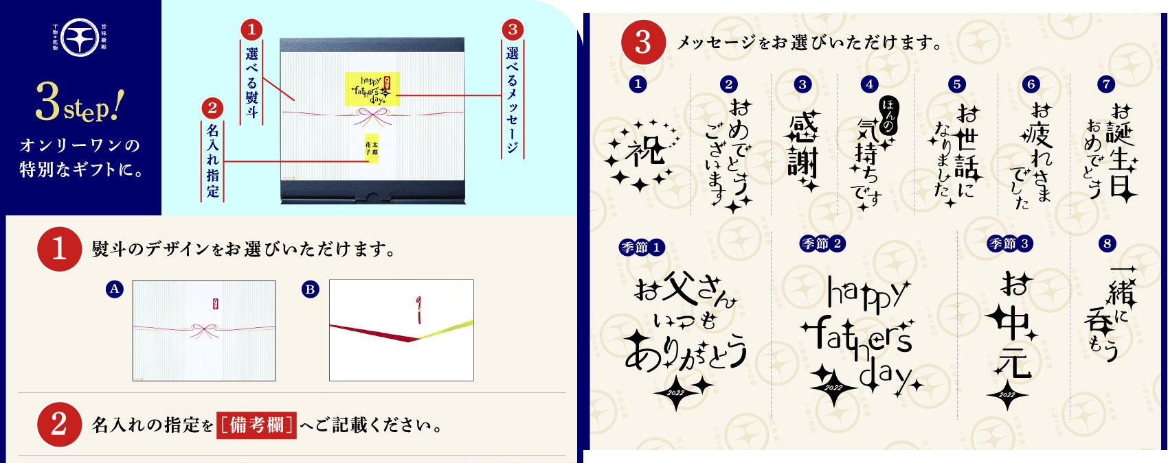 ❶選べる熨斗&❷名入れ指定&❸選べるメッセージでオンリーワンの特別なギフトに。