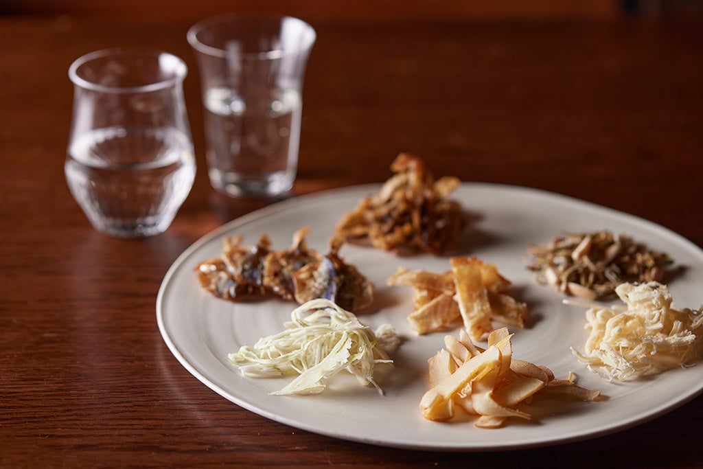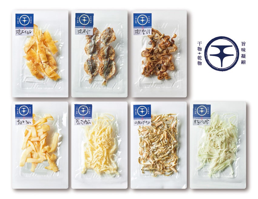 旨みと香ばしさが凝縮しエイヒレ本来の食感も楽しめる「①焼エイヒレ」、ほんのり甘めの味付けがクセになる「②焼あじ」、豊かな香りと柔らかさがちょっとしたご馳走感も醸し出す「③うまいか」、噛むほどにイカの旨みが口いっぱいに広がる 「④やわらかさきいか」、小魚の程よく甘い味付けとアーモンドの塩気が好相性の「⑤小魚アーモンド」、コリコリした食感と豊かな貝の旨みが堪能できる珍味「⑥焼きかいひも」、魚のすり身とわかめを混ぜ合わせピリッと山葵風味を効かせた 「⑦わさび白雪」。いずれも、食べ飽きないお酒のお供でありながら、時にはお料理のちょっとしたアレンジに使えるなど、一家に一つは常備しておくと便利な、まさしく❝最強セット❞です。