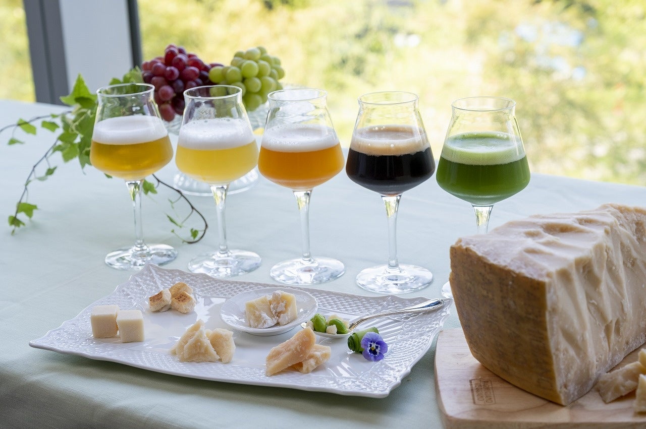 さらに最後のデザートとして、12か月熟成のパルミジャーノ・レッジャーノに和三盆を塗した「パサンボン」と、上質な抹茶を少量の水で溶き、1:7の割合で一般的なピルスナースタイルのビールで割った抹茶ビールのペアリングを提供しました。