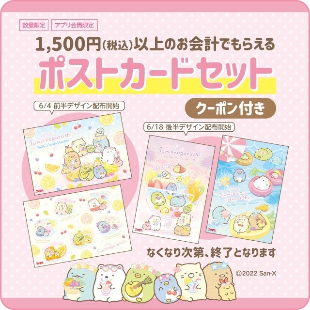 すみっコたちが夏を楽しむカラフルなデザインのポストカード2枚セットには、お得にデニーズをご利用いただける限定クーポンもついています。また、第1弾を6月4日(土)から、第2弾を6月18日(土)からとし、プレゼントするデザインが変更となります。(いずれも、店舗により限定数量の配布となります)