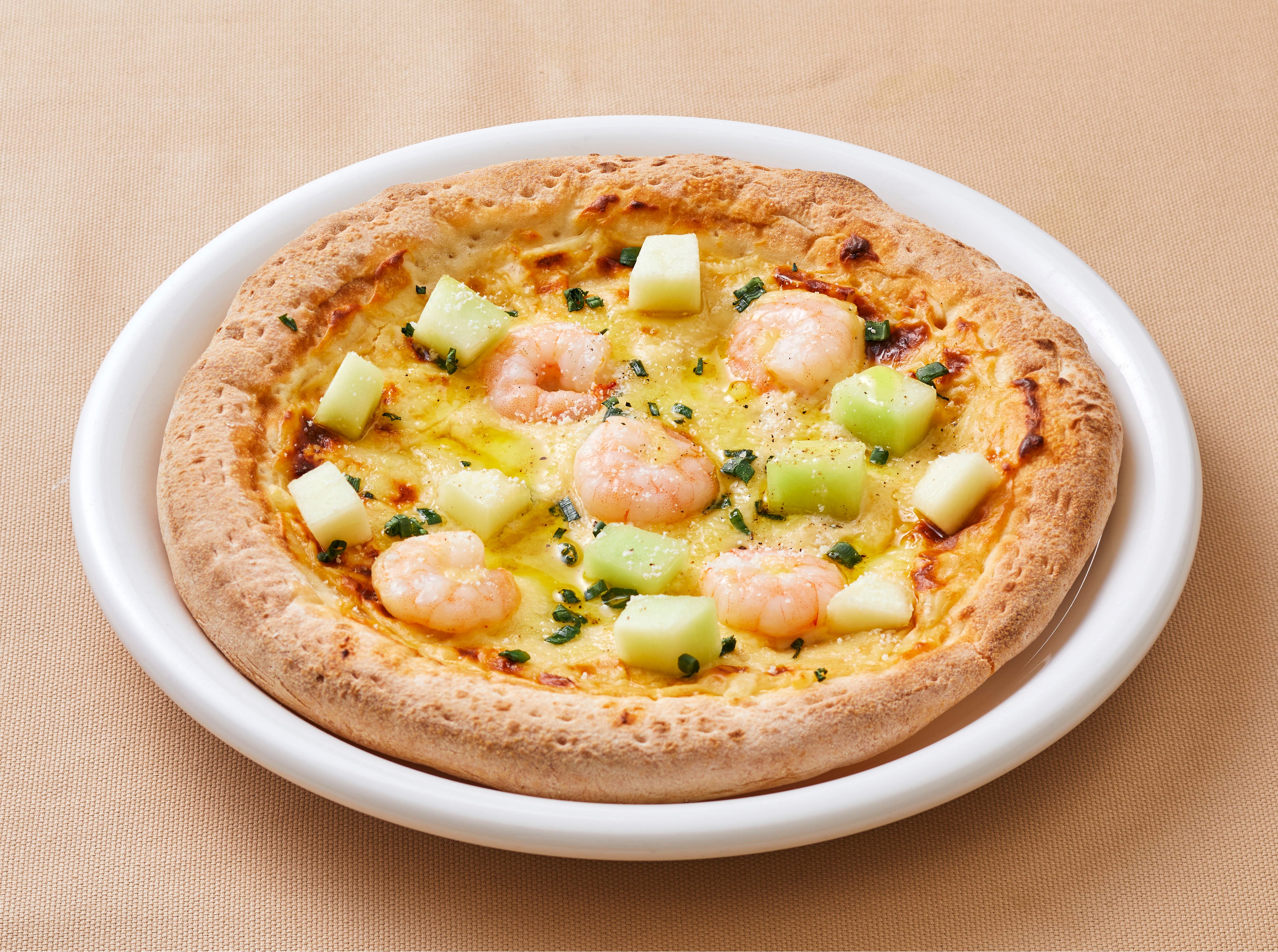 プリプリのえびと甘いメロンクリームソースベースのピッツァです。アクセントに柚子胡椒を使っており、ピリッとした辛さとの相性は抜群です。珍しい組み合わせをどうぞお楽しみください。