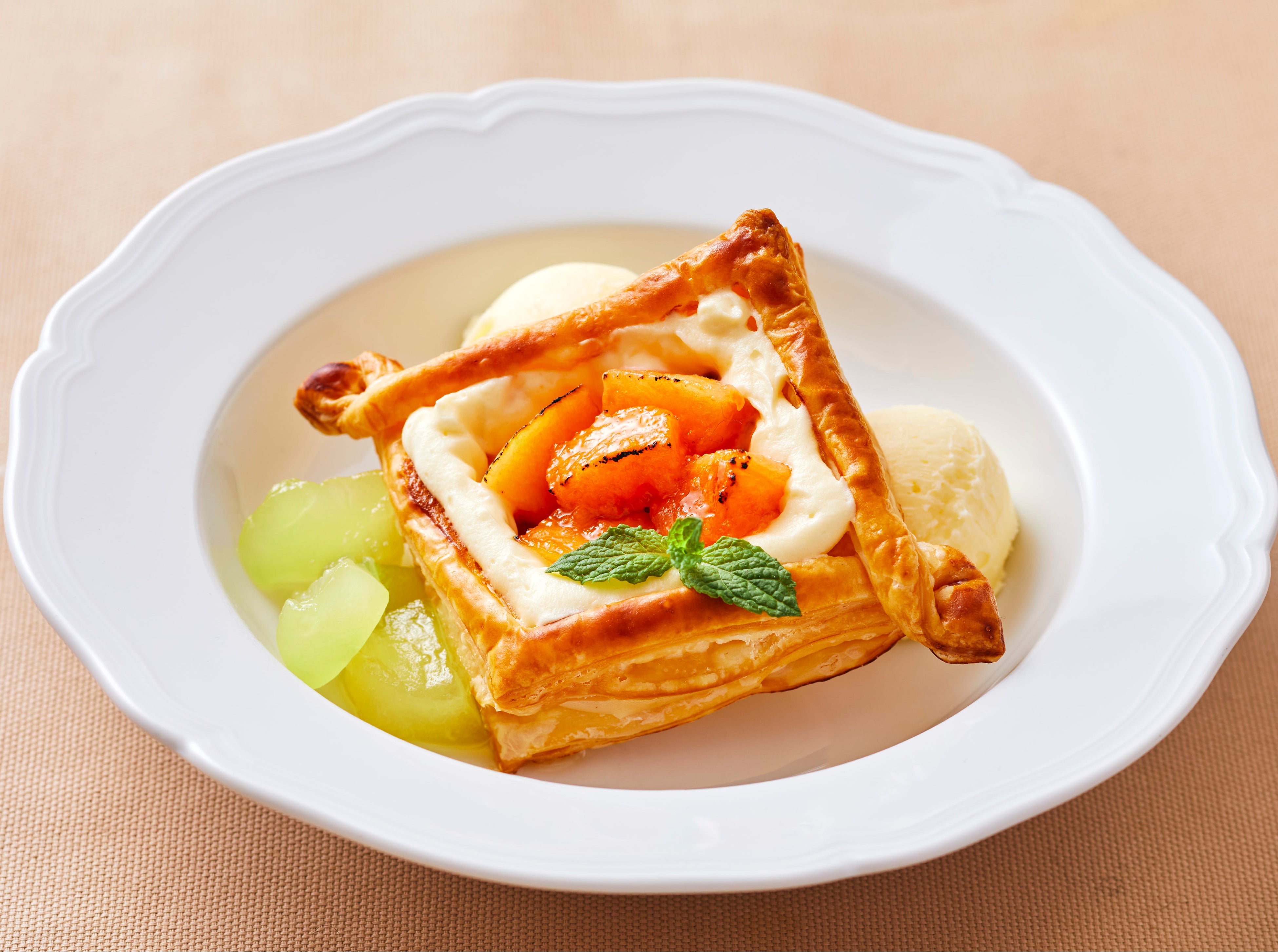サクサクのパイ生地にメロンのカスタードとキャラメリゼしたメロンをトッピングしました。メロンのコンポートとバニラアイスで様々な食べ合わせをお楽しみください。