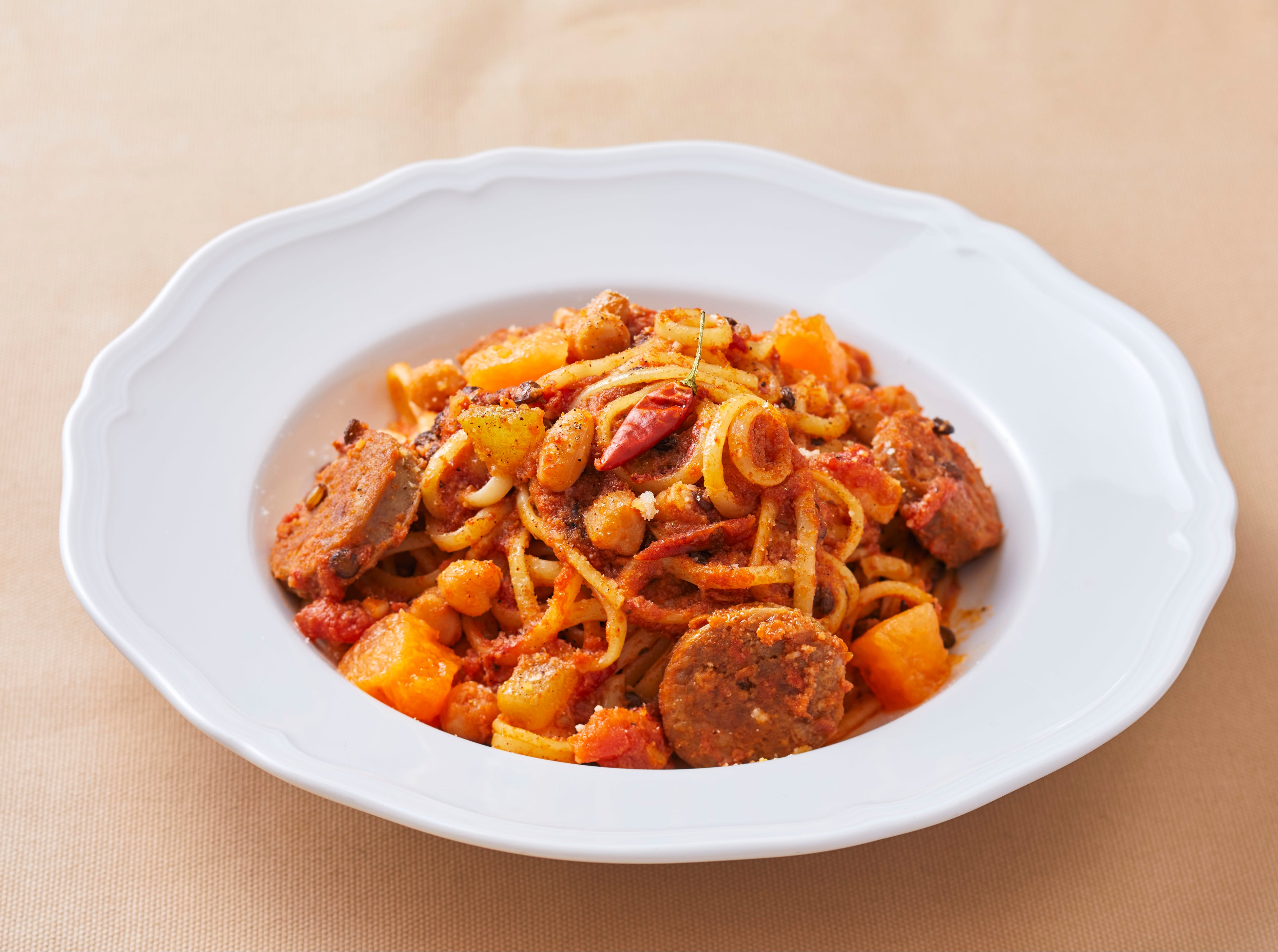 旨味たっぷりのサルシッチャとひよこ豆、レンズ豆、白インゲン豆をピリ辛のンドゥイヤ風のトマトソースで煮込みました。熟したメロンは甘みが増し、唐辛子の辛さとマッチした初夏を感じられるパスタです。