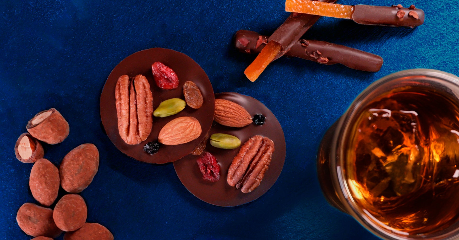 ピーカンナッツ、アーモンド、レーズン、クランベリーをトッピング。チョコレートとナッツの食感や風味、ドライフルーツの酸味や甘味の美味しさがギュッと凝縮したチョコレート。