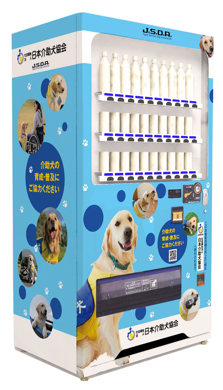 社会福祉法人日本介助犬協会(以下、協会)は手足に障がいのある方の手助けをする介助犬の育成普及活動を行っています。その活動の約9割は個人や企業団体による寄付や募金で成り立っており、昨今のコロナ禍では対面でのイベントや募金活動が制限され、それらによる収入が大幅に減っています。安定した活動を継続していくため協会では様々な形での支援の方法を扱っており、その中に自動販売機による支援があります。