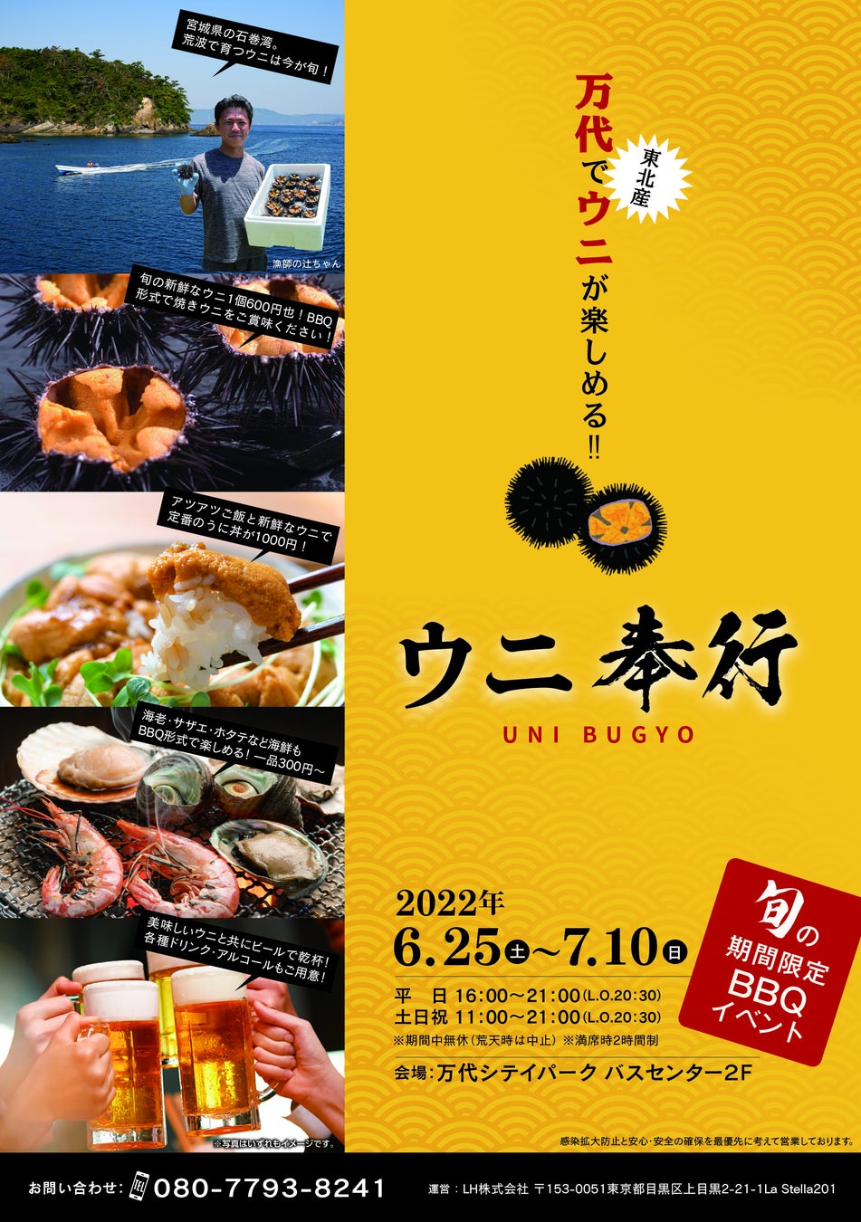 LH株式会社(代表取締役:林昭信)は、2022年6月25日(土)より 新潟市にて「~万代でウニが楽しめる~ ウニ奉行」を開催させていただくこととなりましたので ご報告いたします。 「ウニ」の「旬」はいつ頃かご存知でしょうか? そう。今なんです! このイベントは今が「旬」真っ盛りの東北産「ウニ」を新潟のお客様にお手頃価格でご提供する ことで「ウニは高い!」という概念を覆し、さらなる魅力を伝えたく開催いたします。 この度の開催の折には、たくさんの方々にご来店いただき“石巻産のウニ”をご堪能いただけれ ば幸いです。炭火で食べる旬のウニと海産物のBBQをお楽しみください。