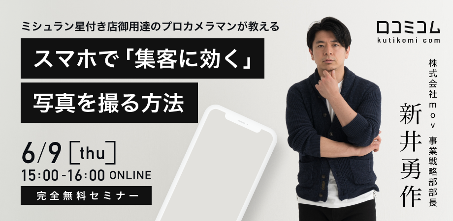 お客様の声のDXサービス「口コミコム」を運営する株式会社mov(代表取締役:渡邊 誠、本社:東京都渋谷区、以下mov)は、「ミシュラン星付き店御用達のプロカメラマンが教える、スマホで『集客に効く』写真を撮る方法」セミナーを開催致します。6月9日(木)オンラインで開催、参加費は無料です。