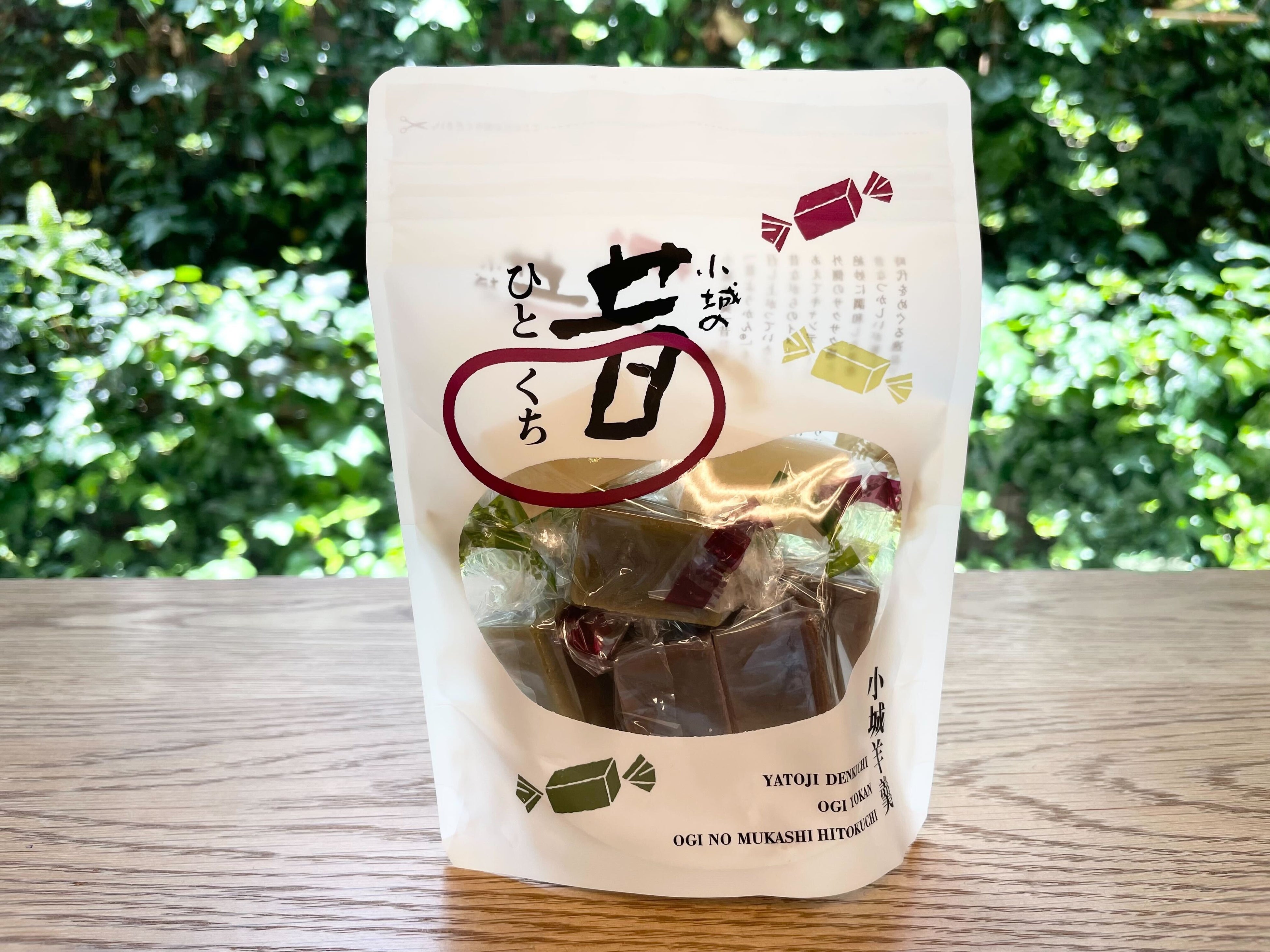 昔ひとくちは、表面に砂糖の結晶ができ、外はシャリシャリ、中はしっとりとした八頭司伝吉自慢の「昔ようかん」を食べやすいひと口サイズにしたもの。