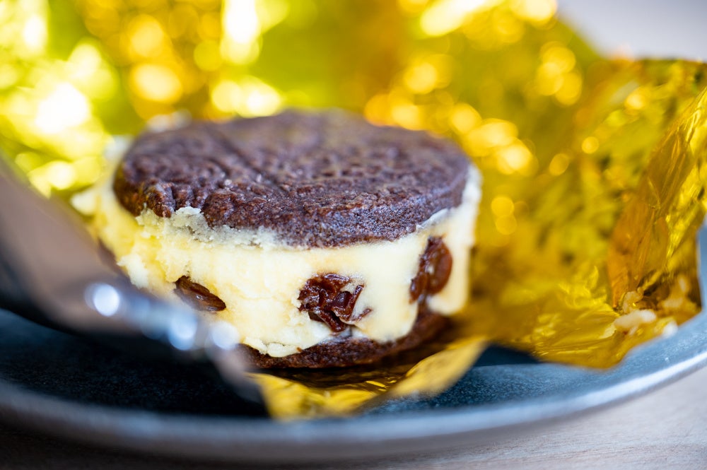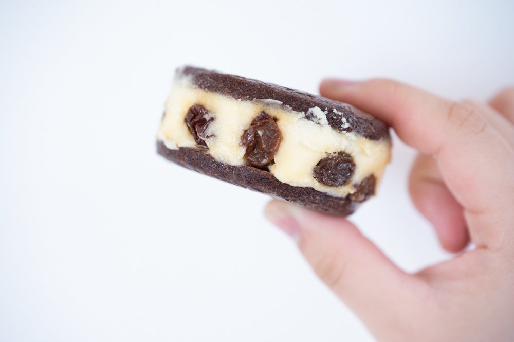サブレの間には、バタークリームがたっぷりサンドされ、周りには、ラムレーズンがゴロゴロとトッピングされています。