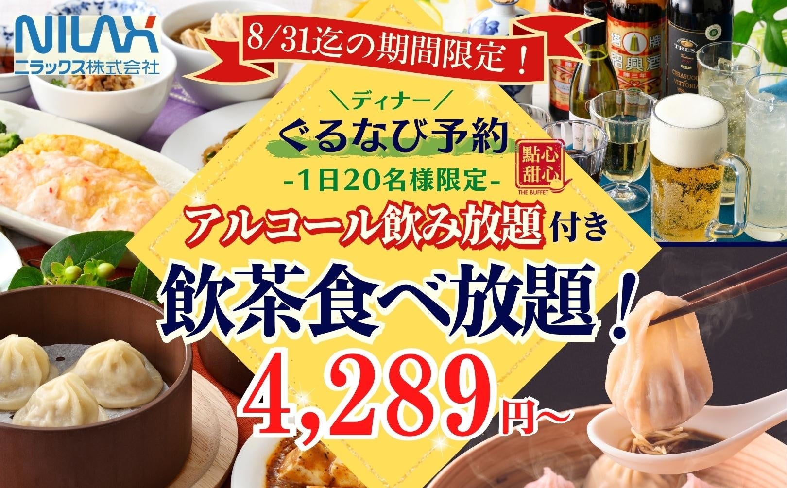 食べ放題のテーマパーク、ニラックス株式会社(本社:東京都武蔵野市、代表取締役:崎田 晴義)が運営する『ザ ブッフェ點心甜心 心斎橋パルコ店』では、2022年8月31日(水)迄の期間、ディナータイム1日20名様限定、ぐるなび予約でプレミアムコースに60分間のアルコール飲み放題が付いたお得なコースが登場いたしました。