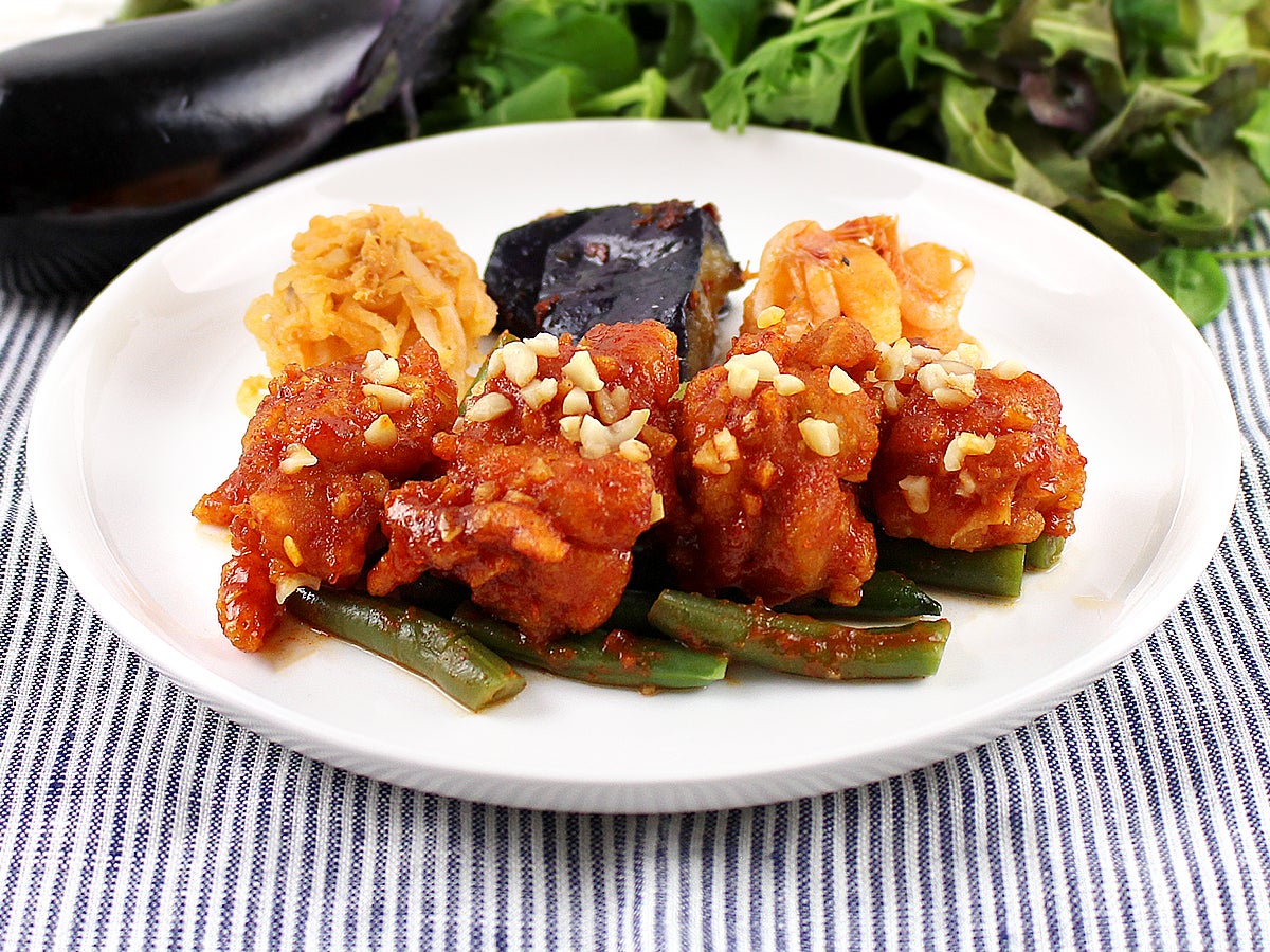 コチュジャンとトマトケチャップをベースに、にんにくを加えた甘辛い本格的なヤンニョムチキンを塩分を1.3gでご用意しました!しっかりとした辛さにアクセントとなるアーモンド、インゲンを添えておりますので食感もお楽しみいただけます。