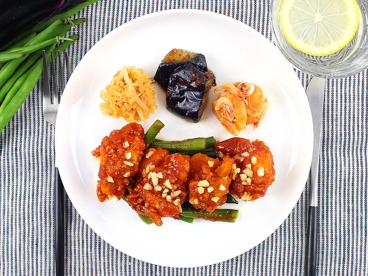 コチュジャンとトマトケチャップをベースに、にんにくを加えた甘辛い本格的なヤンニョムチキンを塩分を1.3gでご用意しました!しっかりとした辛さにアクセントとなるアーモンド、インゲンを添えておりますので食感もお楽しみいただけます。