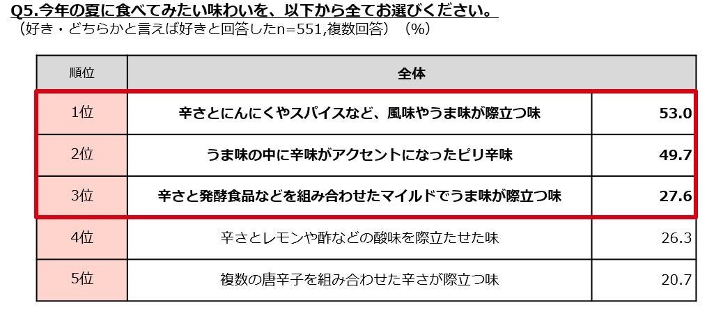 ・今夏に食べたい激辛料理の味わいは、「辛さとにんにくやスパイスなど風味やうま味が際立つ味」、「うま味の中に辛味がアクセントになったピリ辛味」。