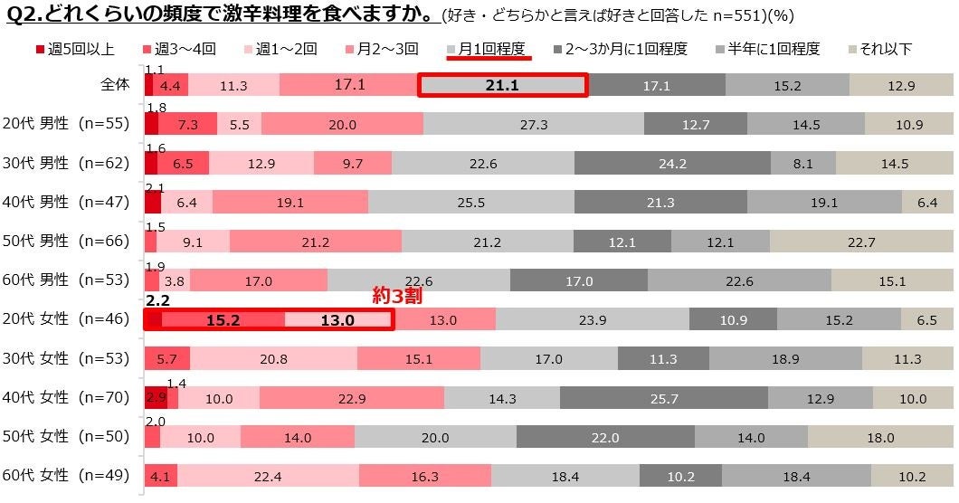 調査では、わずかながらも昨年より激辛を好む層が増加。嫌いな層と拮抗する結果に。若年層では、「週3~4回」以上の回答が約2割と、他の層と比べて高い頻度で食べていることがわかりました。
