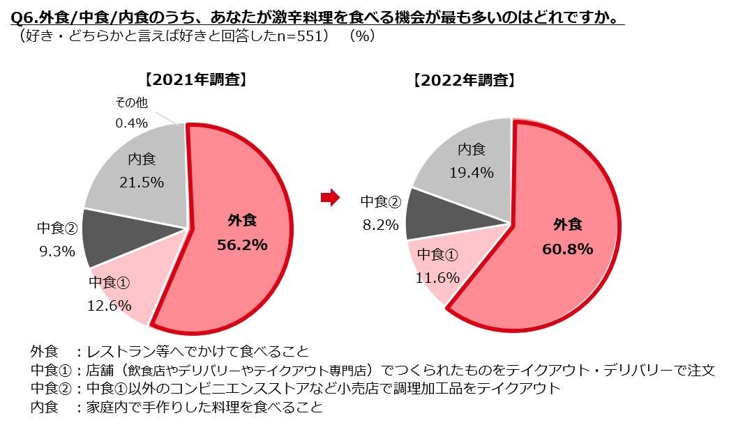 ・激辛料理を食べる機会が最も多いのは、「外食」が6割で昨年と同水準。