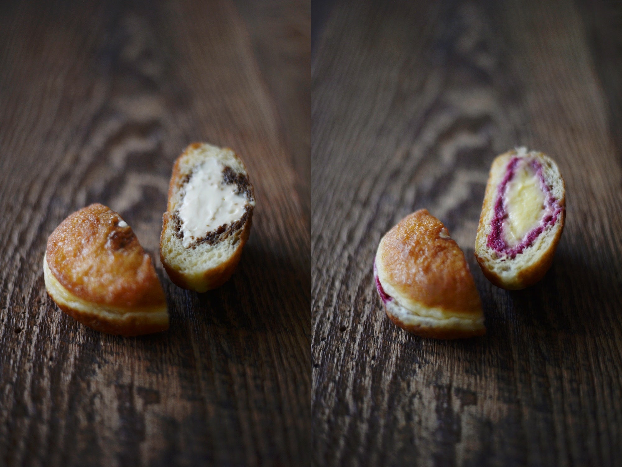 フカフカの生地に、マスカルポーネとカスタードクリームをあわせたっぷりと入れました。エスプレッソ、ランポーネ(フランボワーズ)2種類の味です。