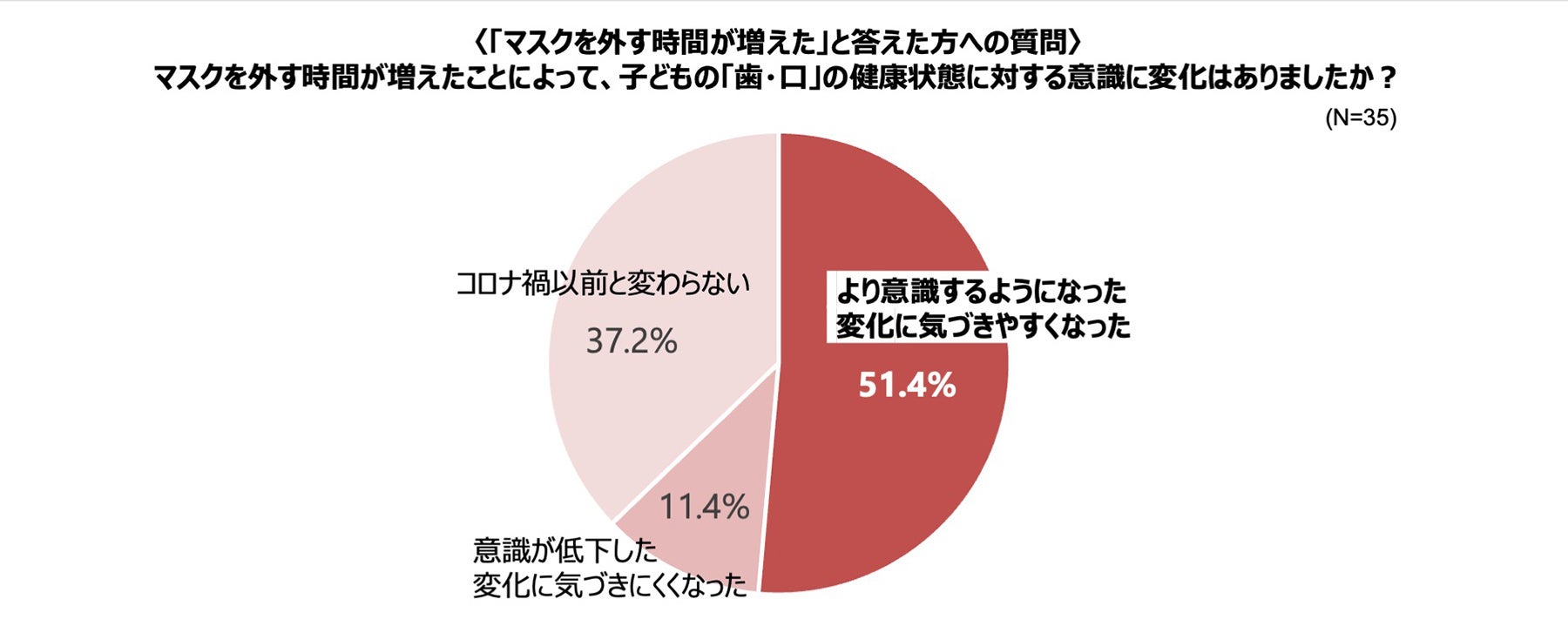 「ここ1、2ヶ月で、子どもがマスクを外す時間が増えた」と回答した親のうち、51.4%の人が「マスクを外す時間が増えたことによって、子どもの『歯・口』の健康状態に対する意識に変化はあった」と回答しました。マスクを外す時間が今後増えることが予想されるなか、口腔に対する意識もあがると考えられます。