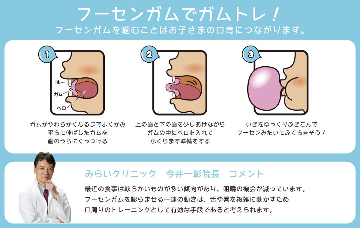 お子様の口周りの運動のためには、「シャボン玉」や「吹き戻し」など口をつかった遊びが効果的です。フーセンガムをふくらませることは「噛む」ことに加えて「舌を動かしてガムをまとめる・伸ばす」「口をしっかり閉る」など、繊細な動きと筋肉運動が必要で口周りのトレーニングになると考えられます。