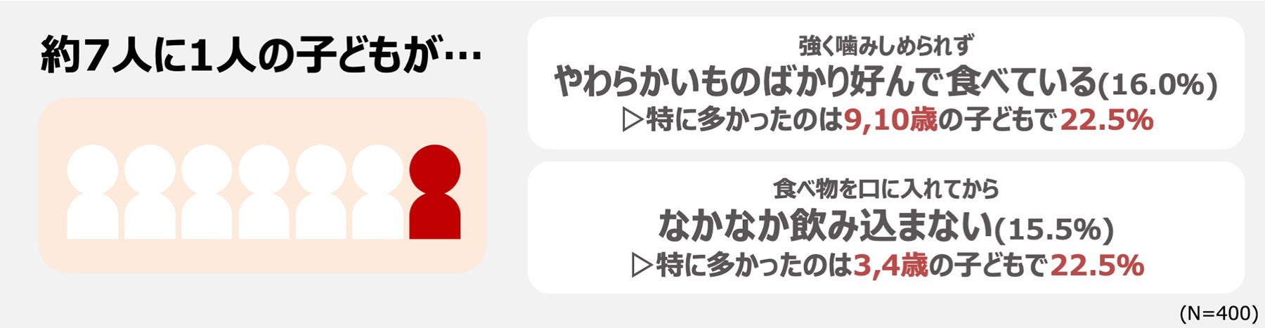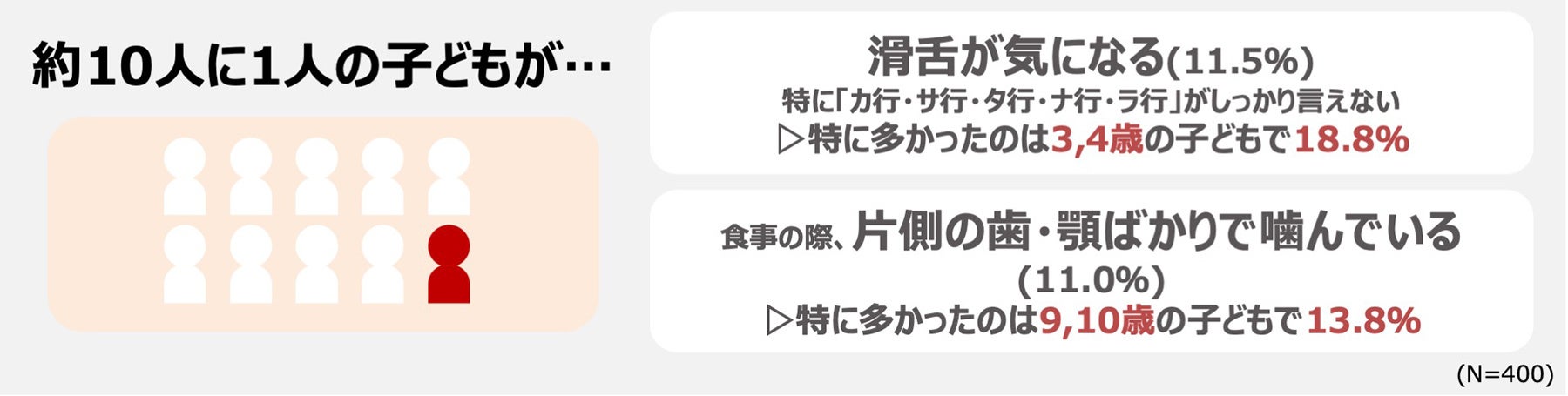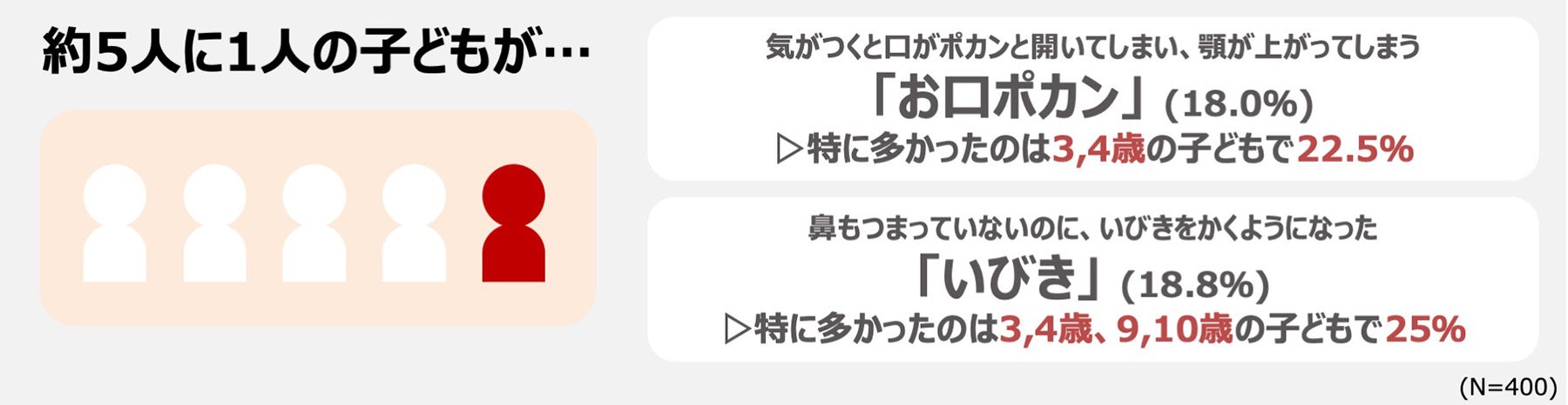 - 約5人に1人の子どもに、 「口腔機能発達不全症」 のサインである「お口ポカン」や「いびき」といった症状があることが判明。