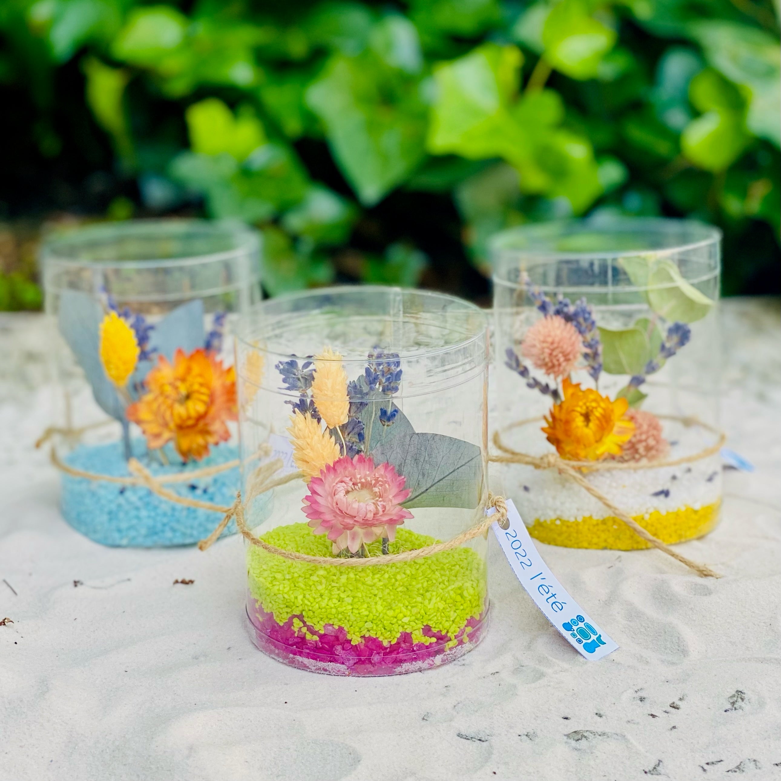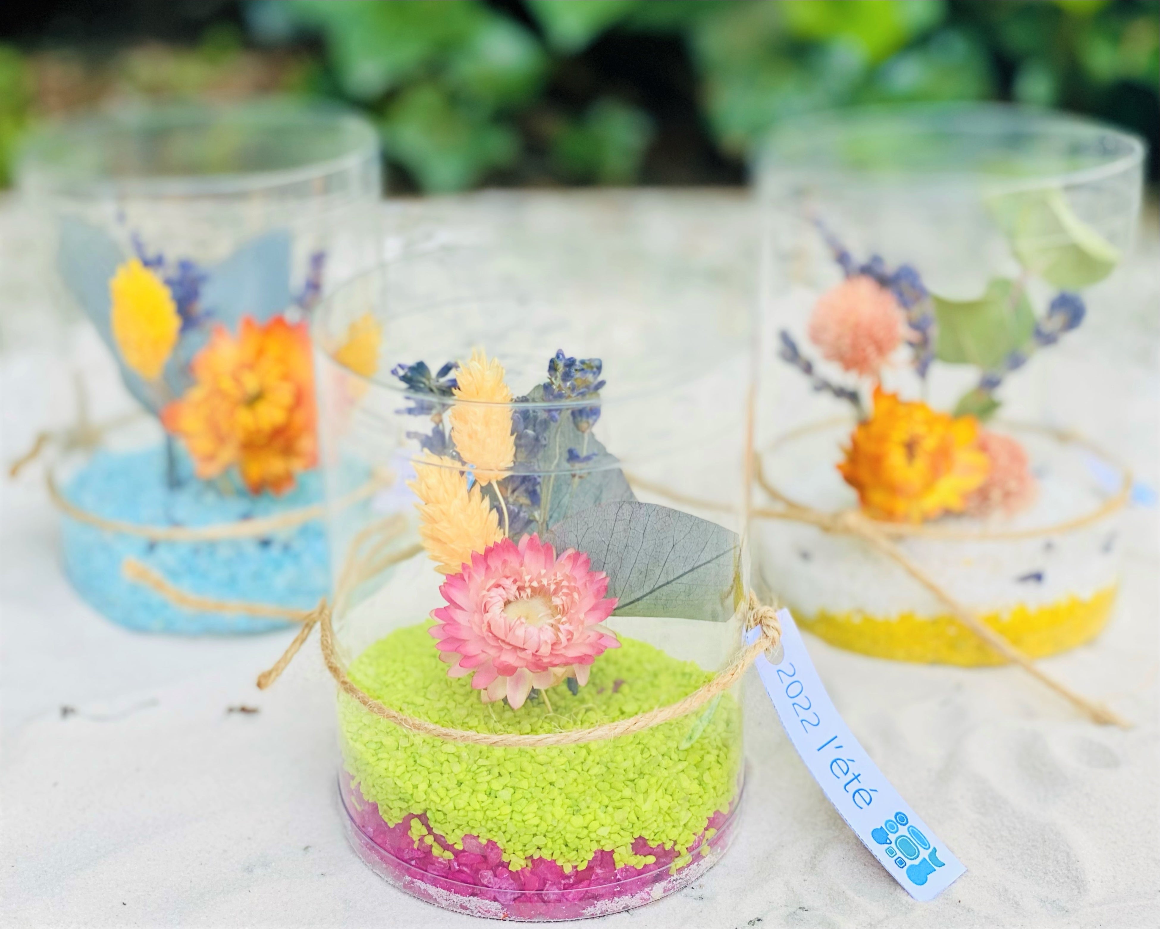 南仏を含む地中海沿岸地域が原産地であるラベンダーをドライフラワーに取り入れて、ミニフラワーアレンジを楽しんでいただきます。また2種類のカラーサンド(色砂)をプラスして植物の美しさを引き立てます。