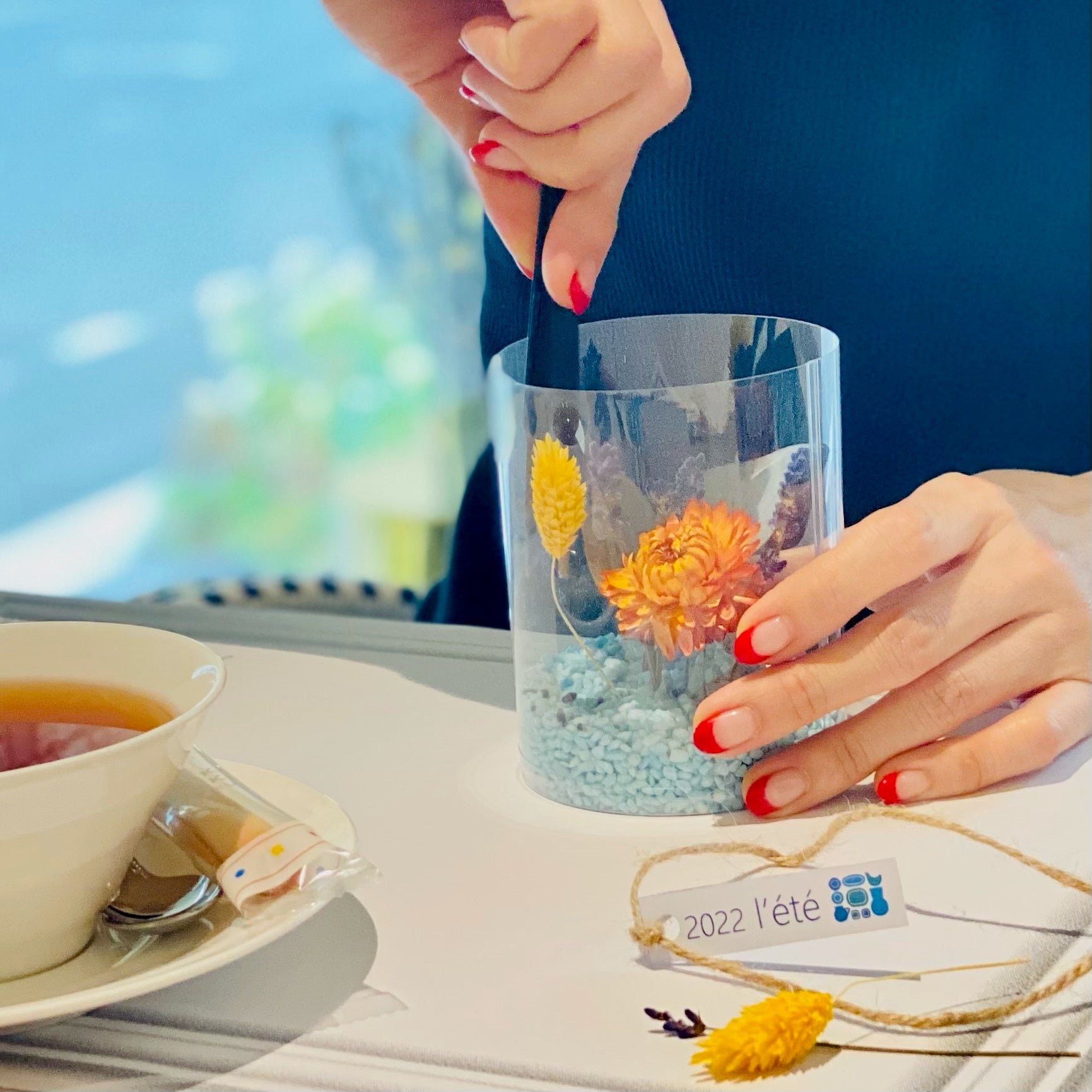内容:アートキット[ドライフラワー、カラーサンド(色砂)、オアシス、麻ひも、プティ シガール、ドリンク(コーヒーまたは紅茶またはジュース)]