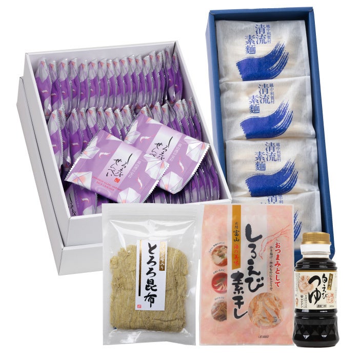 昨年もご好評いただきました、ささら屋の人気米菓の「しろえびせんべい」「こきりこ」と、富山県南砺市利賀村で製造される「清流素麵」、富山県内の食品メーカーのこだわり商品「しろえび素干し」「とろろ昆布」をセットにした、「富山らしい素麺」を楽しめるセット商品です。さらに今年は、本格的な富山の素麺をより楽しんでいただくために、白えびからじっくりと出汁をとった4倍濃縮タイプのだしつゆの「白えびつゆ160ml」もセット内容に追加しています。