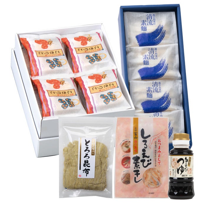 「日本海の幸と清流素麵のセット」は、富山県南砺市利賀村で作られる「手延素麺の至高の逸品」と呼ばれる清流素麵をより楽しんでいただくために、しろえびの濃厚な風味が楽しめる「しろえび素干し」と北海道産の最高級の利尻昆布を使用した「とろろ昆布」、そしてささら屋の人気の米菓商品がセットになっています。