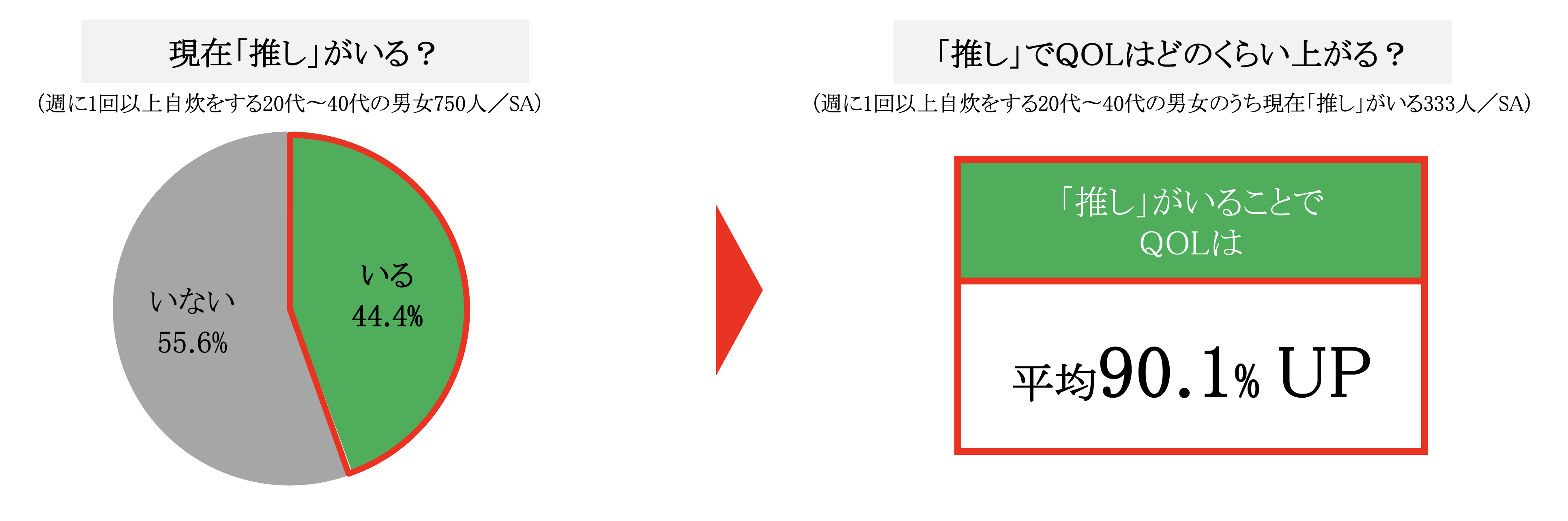 現在、「推し」がいる人は44.4%。「推し」がいることでQOL(生活や人生の質)は平均90.1%上がることがわかりました。