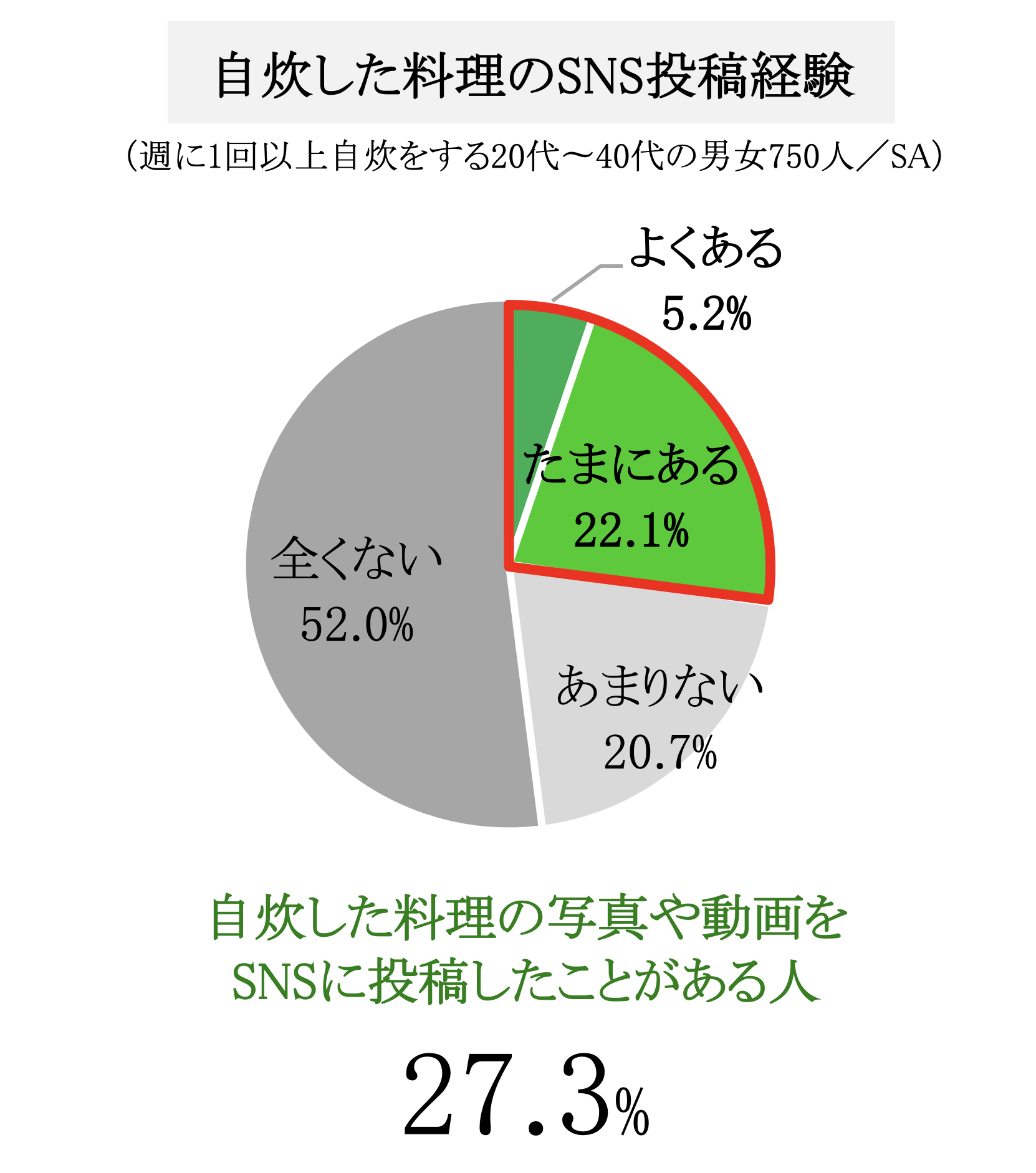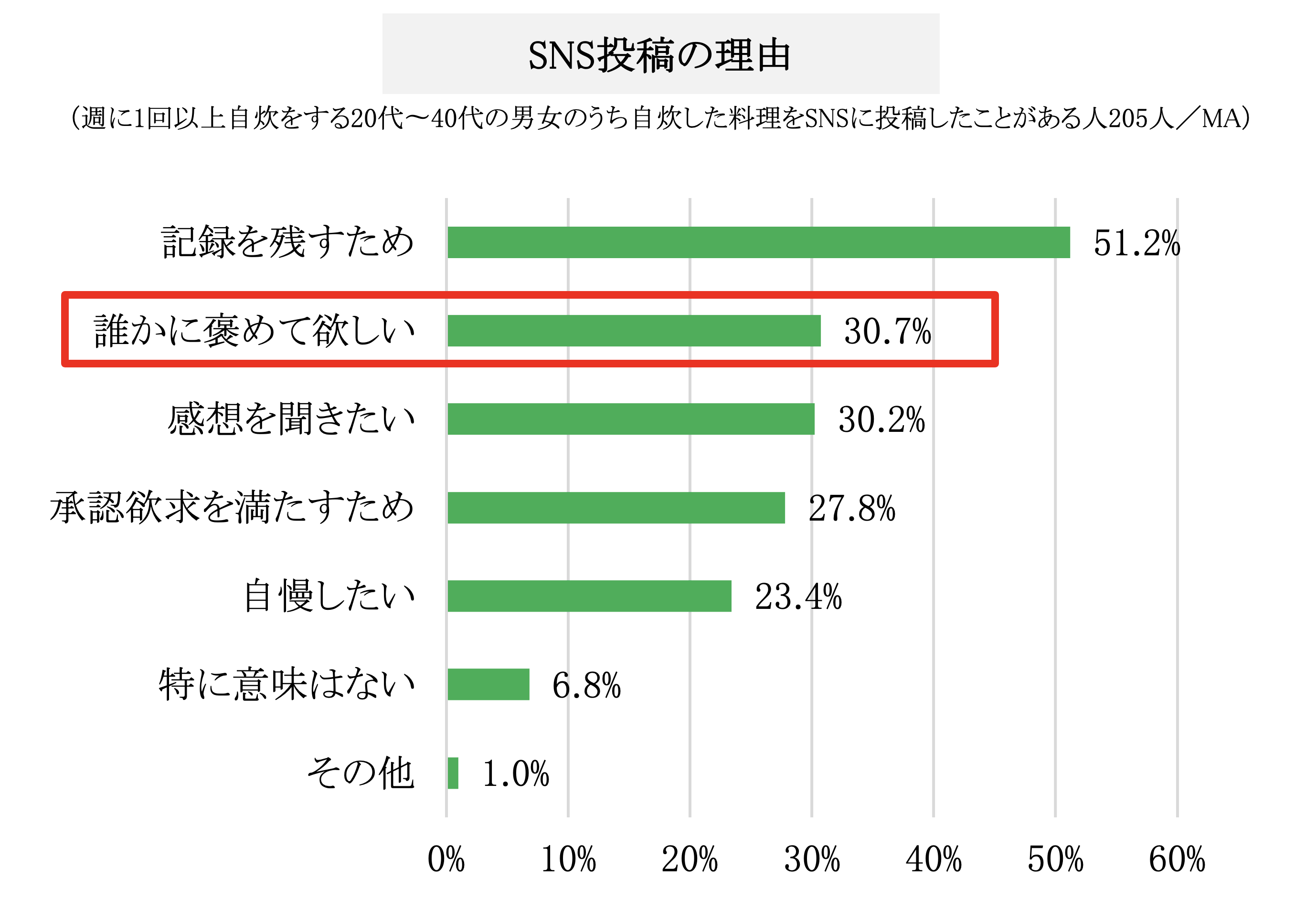 27.3%の人が、自炊した料理を写真や動画に撮って誰かに送ったりSNSに投稿したことがあり、その理由は「記録を残すため」(51.2%)に続いて「誰かに褒めてほしい」(30.7%)という結果になりました。