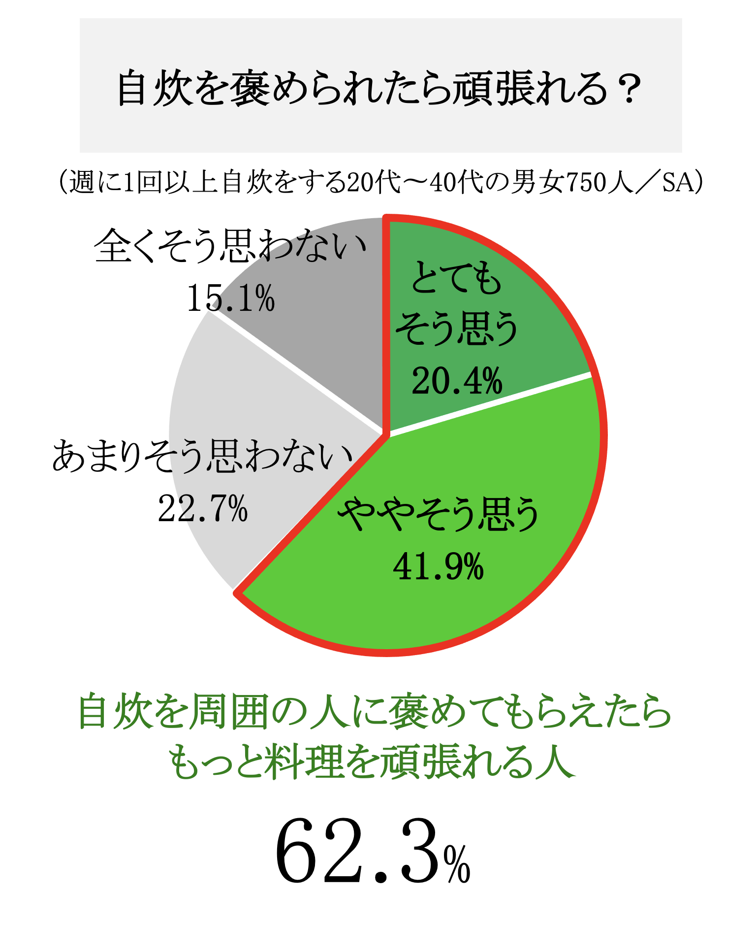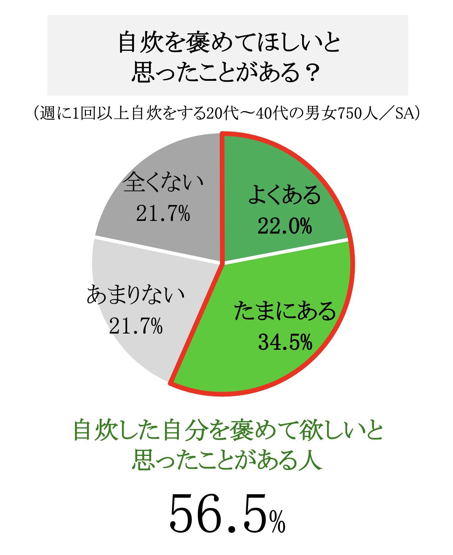 週に1回以上自炊をする20代〜40代の男女750人に対しアンケート調査を実施したところ、「自炊をした私を褒めて欲しい」と思ったことがある方は56.5%、「自炊をしていることに対して褒めが足りない」と感じている方は38.7%。そして、「自炊を周囲の人に褒めてもらえたらもっと料理を頑張れる」という方は62.3%という結果になりました。