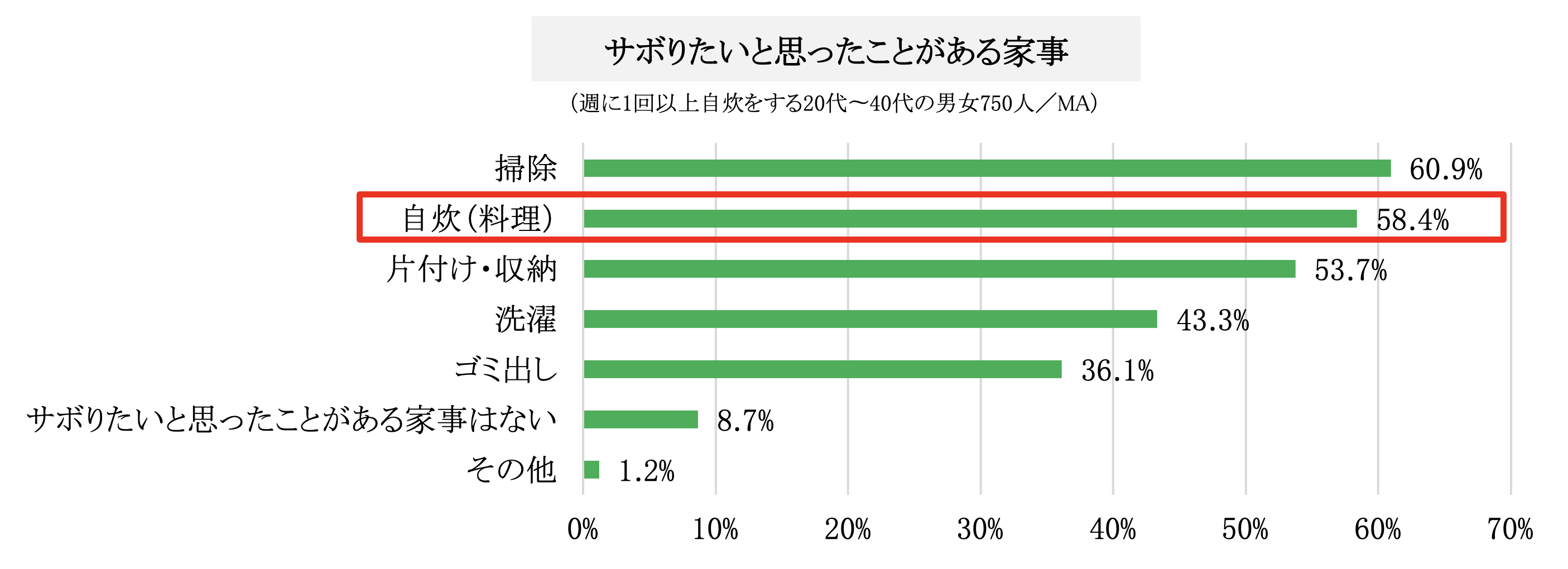 さらに、サボりたいと思ったことがある家事は、1位「掃除」60.9%に続いて2位「自炊」58.4%で、多くの人が、ある程度時間がかかる自炊をサボりたいと思っていることが判明しました。