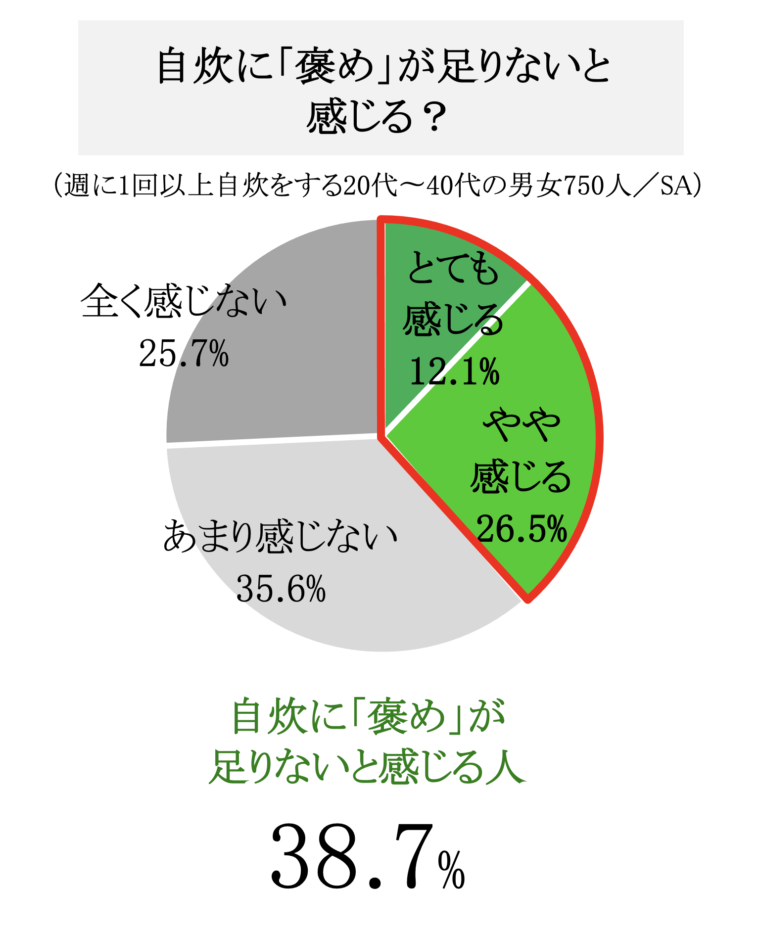また、56.5%の人が自炊をした自分を褒めてほしいと思ったことがあり、38.7%の人が自炊をしていることに対して「褒め」が足りないと感じています。