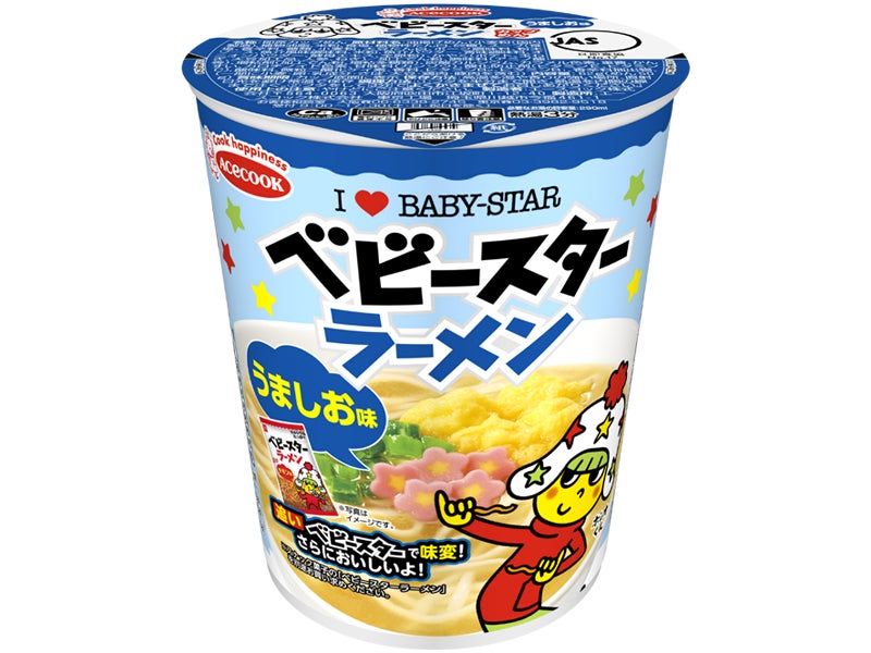 ベビースターの人気定番味である魚介の旨味がきいた「ベビースターラーメン(うましお味)」。そんなうましお味が食べやすいタテ型カップで、見た目もまるでベビースター!ベビースターキャラクター「ホシオくん」が目を引く「ベビースターラーメン カップめん うましお味」として登場します。
