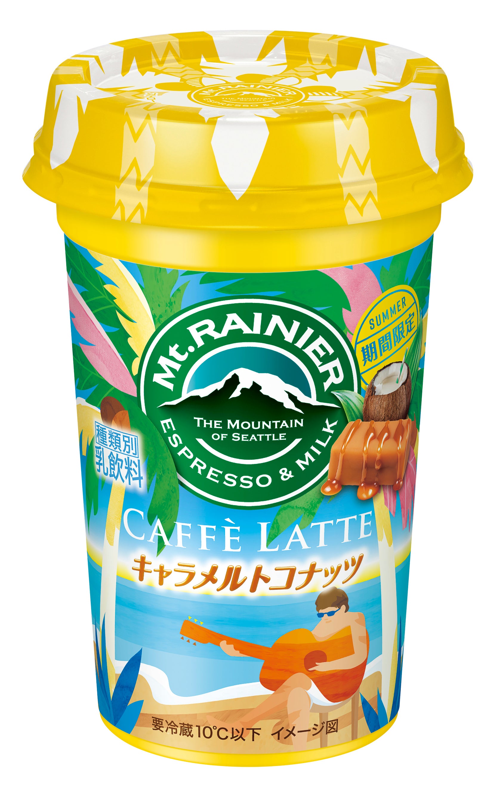 「マウントレーニア カフェラッテ キャラメルトコナッツ」は、エスプレッソにコクのあるミルクをブレンドしたカフェラテにすっきりとした甘さのキャラメルと南国をイメージさせるフィリピン産ココナッツを加えた夏限定のフレーバーコーヒーです。“常夏(トコナツ)”と“ココナッツ”を掛け合わせたネーミング、そして、まるでトコナツリゾートでバカンスを満喫しているような気分を楽しめる2種類のパッケージデザインで夏を演出します。
