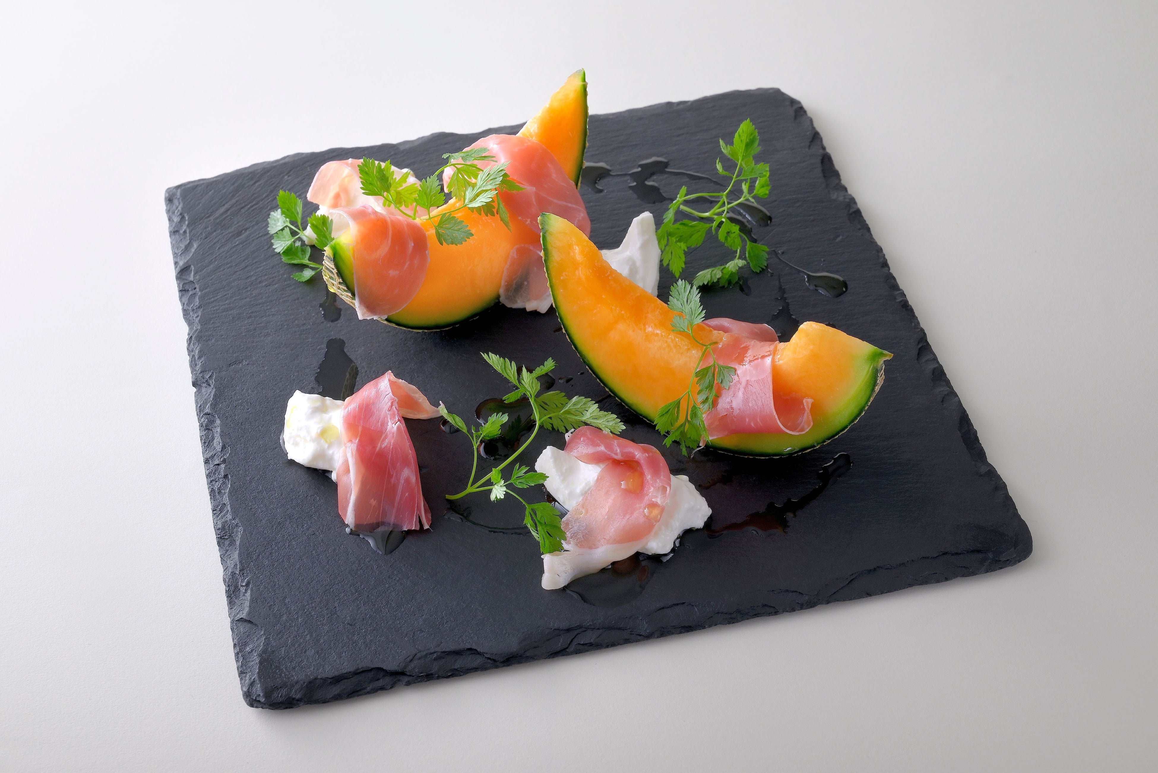 なめらかな舌触りと甘味の強い奥深い味わいが特徴の鉾田産メロンにパルマ産生ハムの塩気とブラータチーズのまろやかな口当たりが三味一体となった贅沢な一皿。