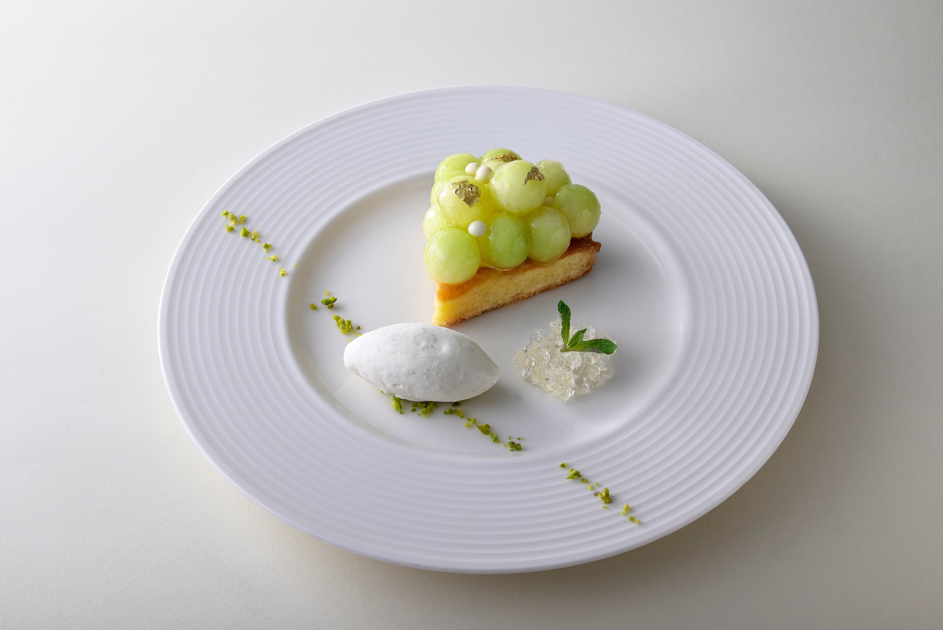 レモンゼストを加えた爽やかなスポンジはジューシーな鉾田産メロンの風味を引き立てて上品な味わいに。グレープフルーツのウォッカが香るシロップがアクセント。