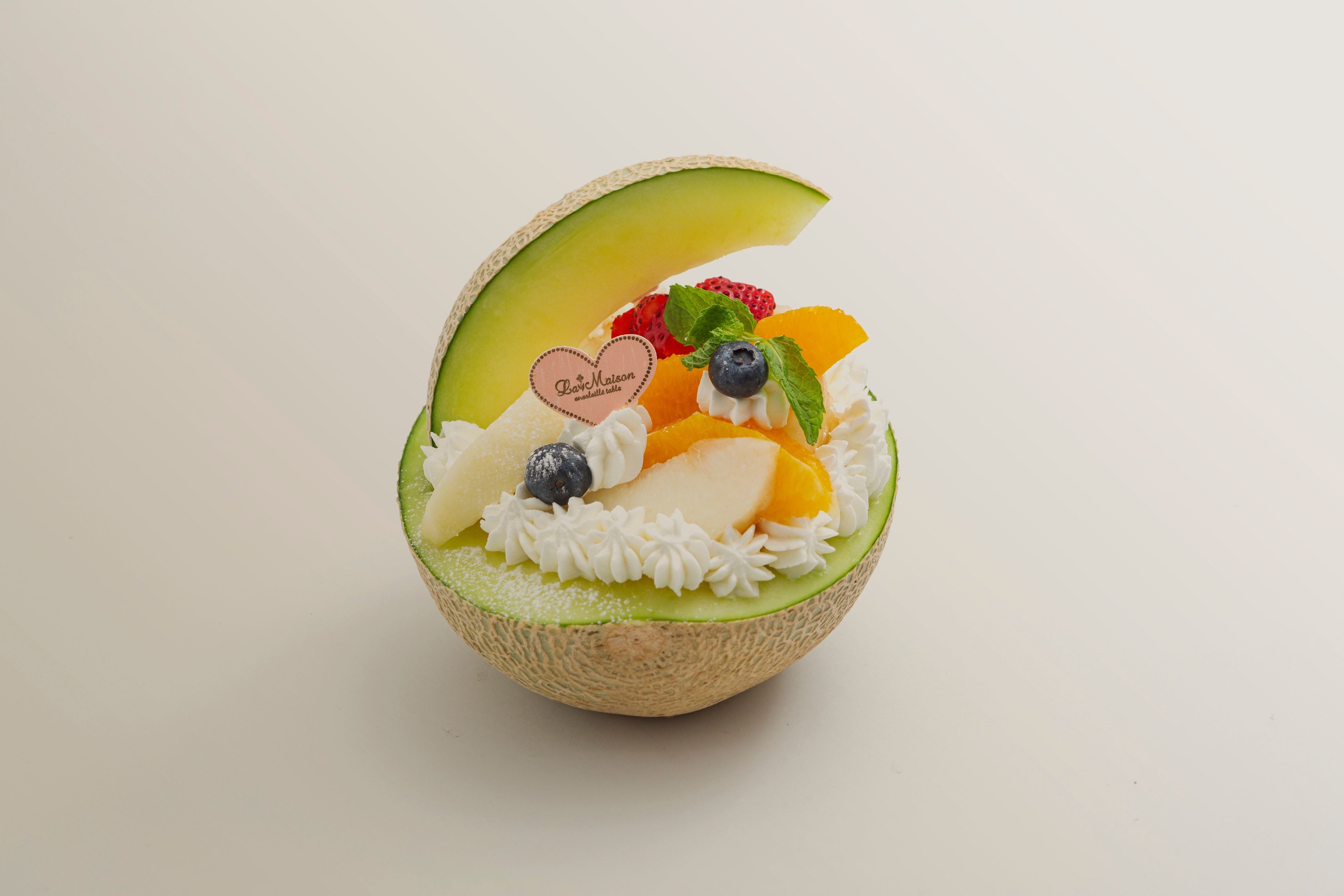 鉾田産のメロンを贅沢に半カットし、バスケットに見立てたメロンの中にバニラアイスと旬のフルーツをたっぷり盛り付けました。