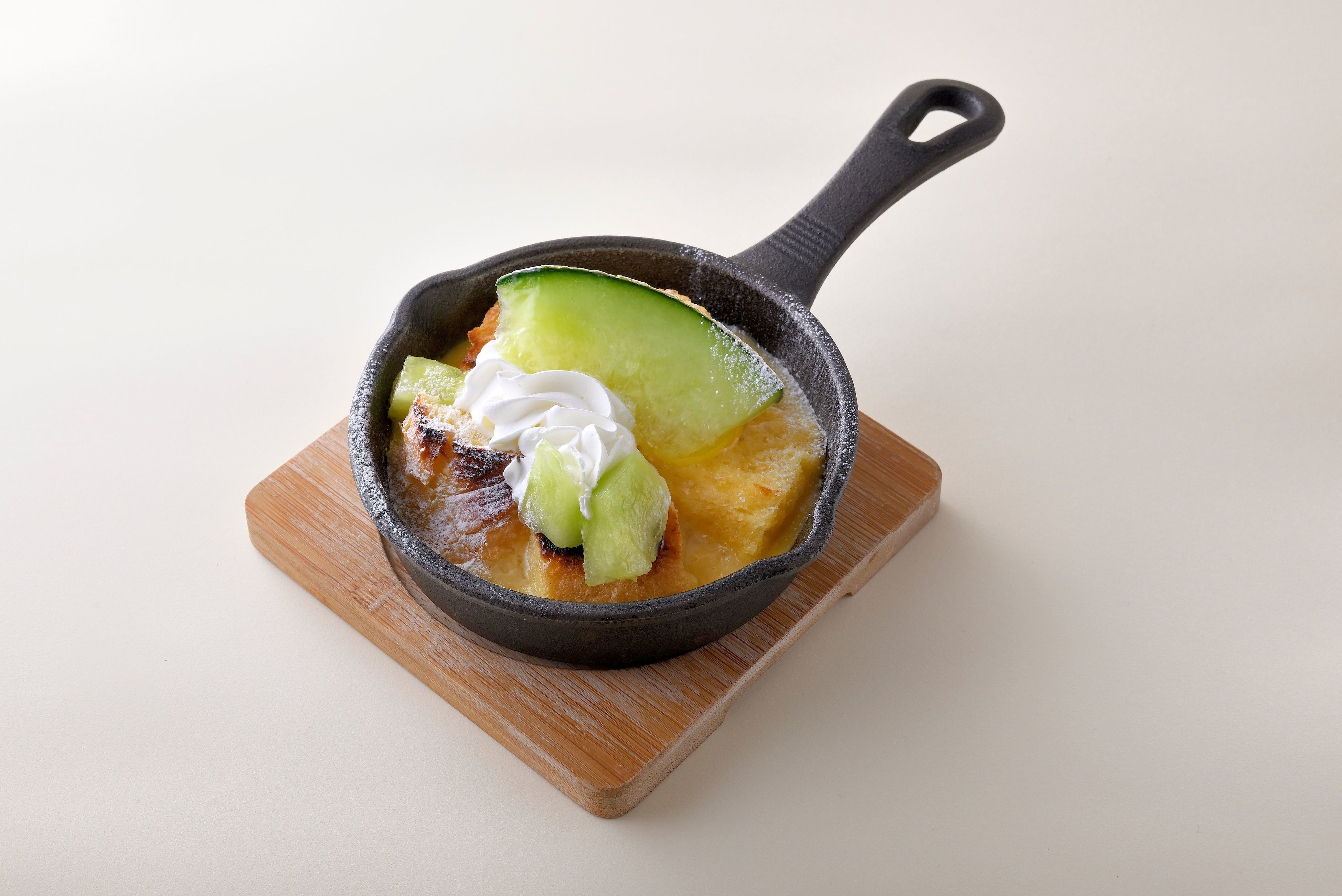 店内の石窯オーブンで焼き上げたフレンチトースト。ホイップクリーム、ジューシーな鉾田産メロンと一緒にあつあつで楽しんで。