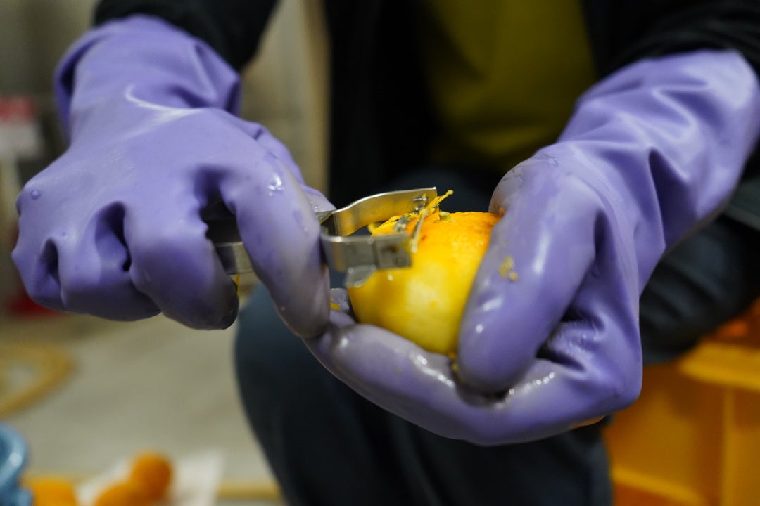 醸造では、およそ40kgのゆずから、風味の凝縮された果皮だけを手作業でていねいに切り出し、麦汁煮沸後および発酵段階でじっくり浸漬。上品な柑橘香を余すところなく引き出しています。
