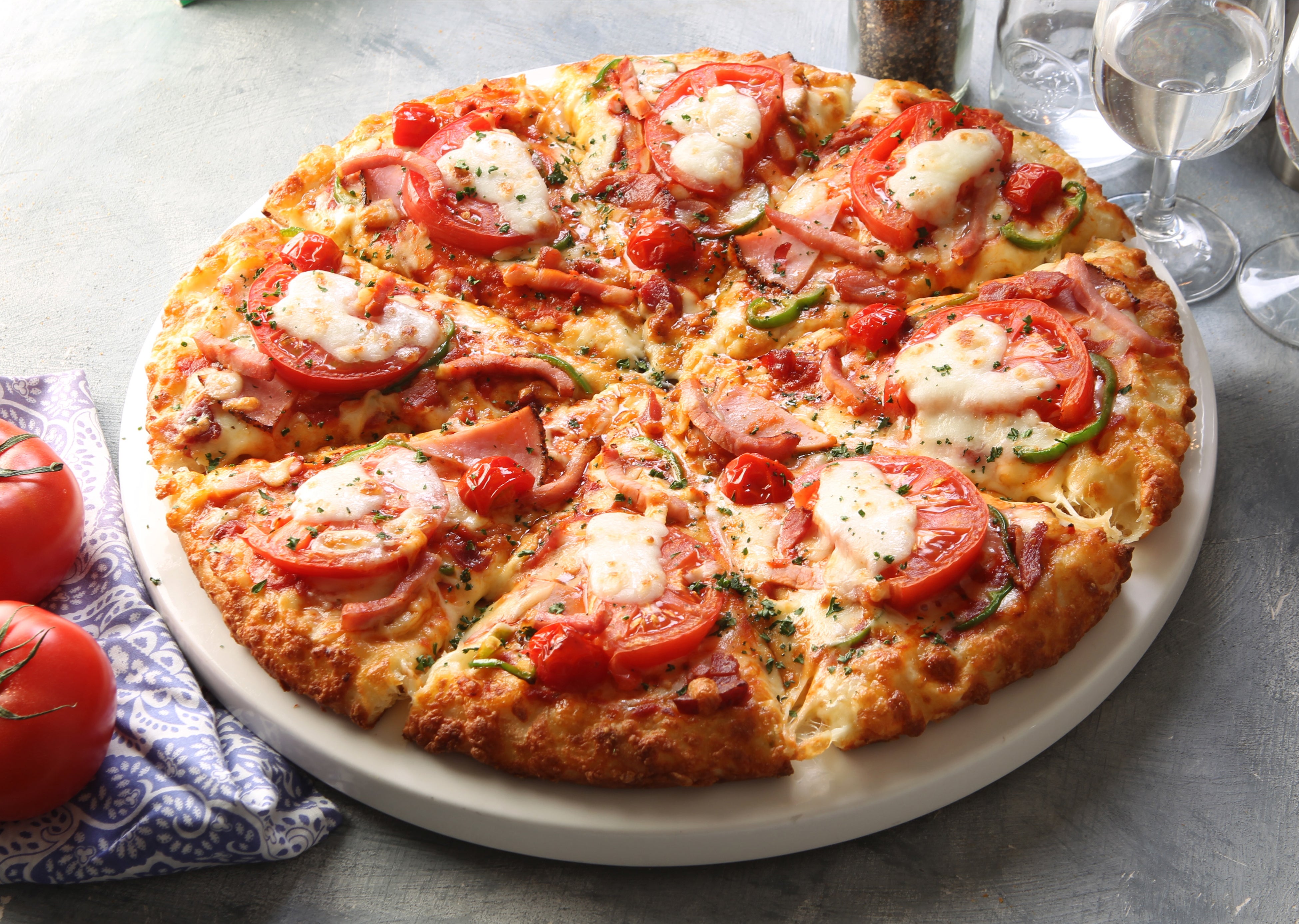 夏の新作『イベリコと熟成ハムのピザ』は、上質な脂の甘みが特徴のスペイン産イベリコ豚のベーコンと、7日間熟成した特選ロースハムをたっぷりトッピングし、特製のオニオンサワークリームで爽やかな味わいに仕上げた新メニューです。