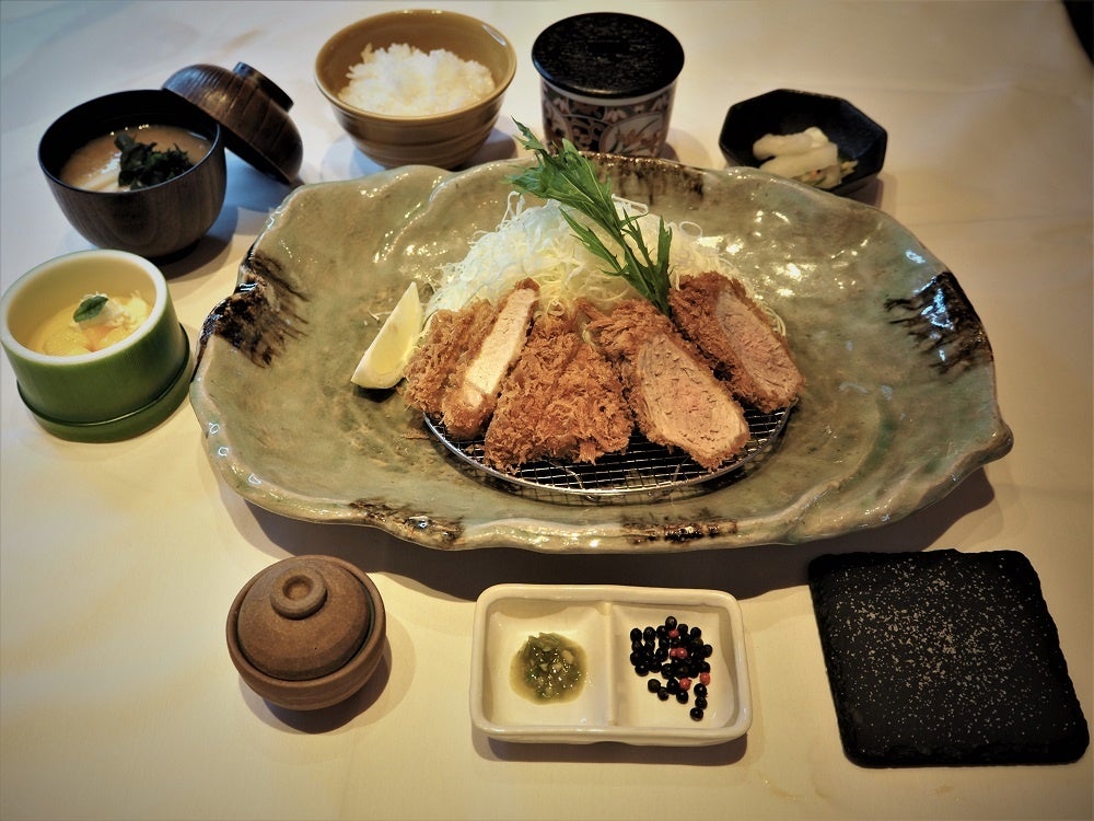 六穀豚ヒレかつ(120g)・塩漬け生粒胡椒・刻みわさび・淡路島の藻塩・ご飯・味噌汁・漬物2種盛り・キャベツ・茶碗蒸し・南高梅・マンゴープリン