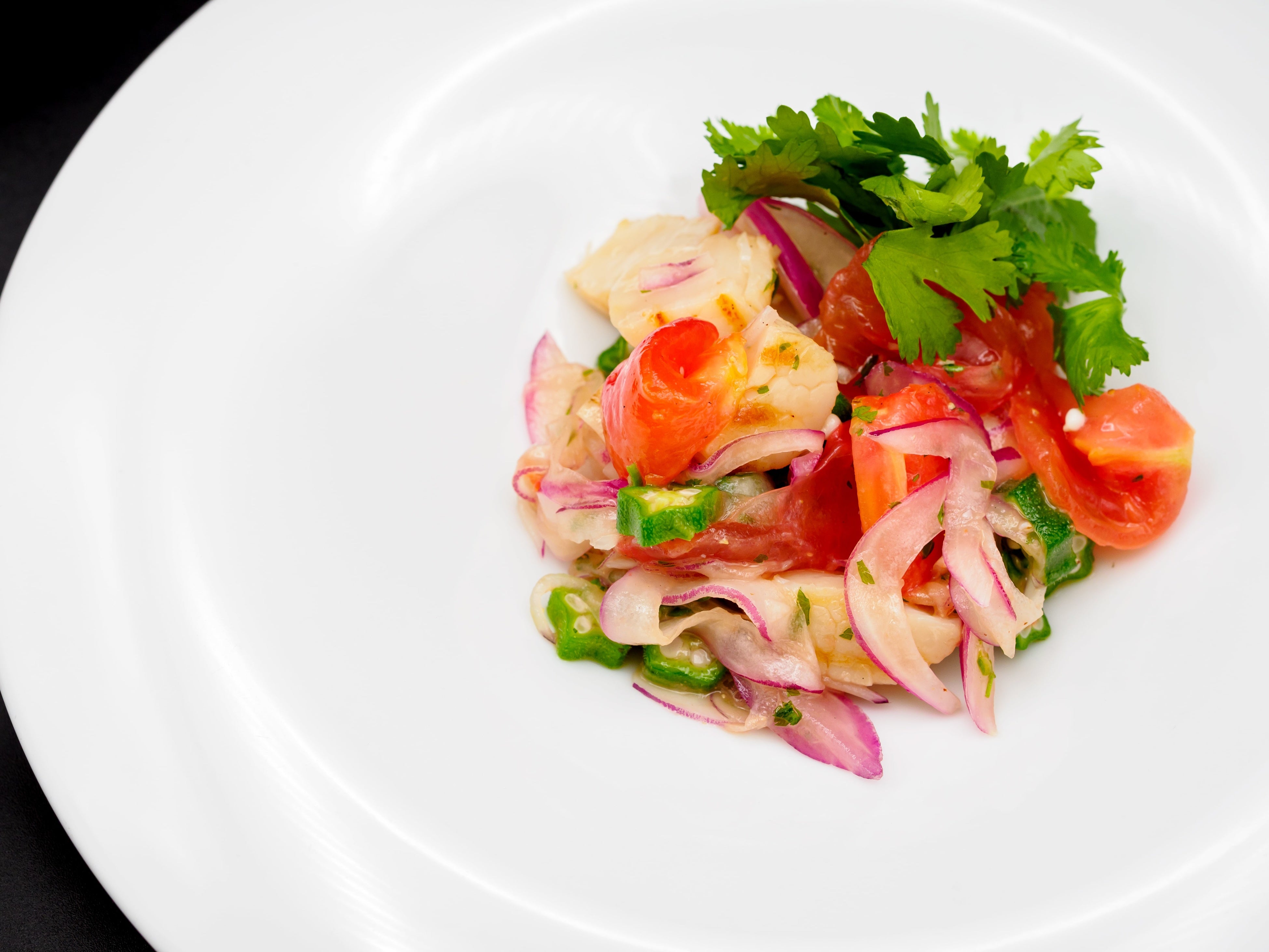 ホタテは炙ることで食感を出し、トマトやオクラなどの夏野菜と和えて、アクセントにパクチーを添えました。
