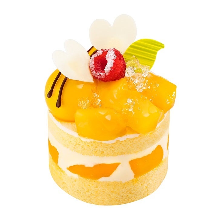マンゴー果肉とココナッツムースをスポンジでサンド。マンゴームースのミツバチで愛らしく。