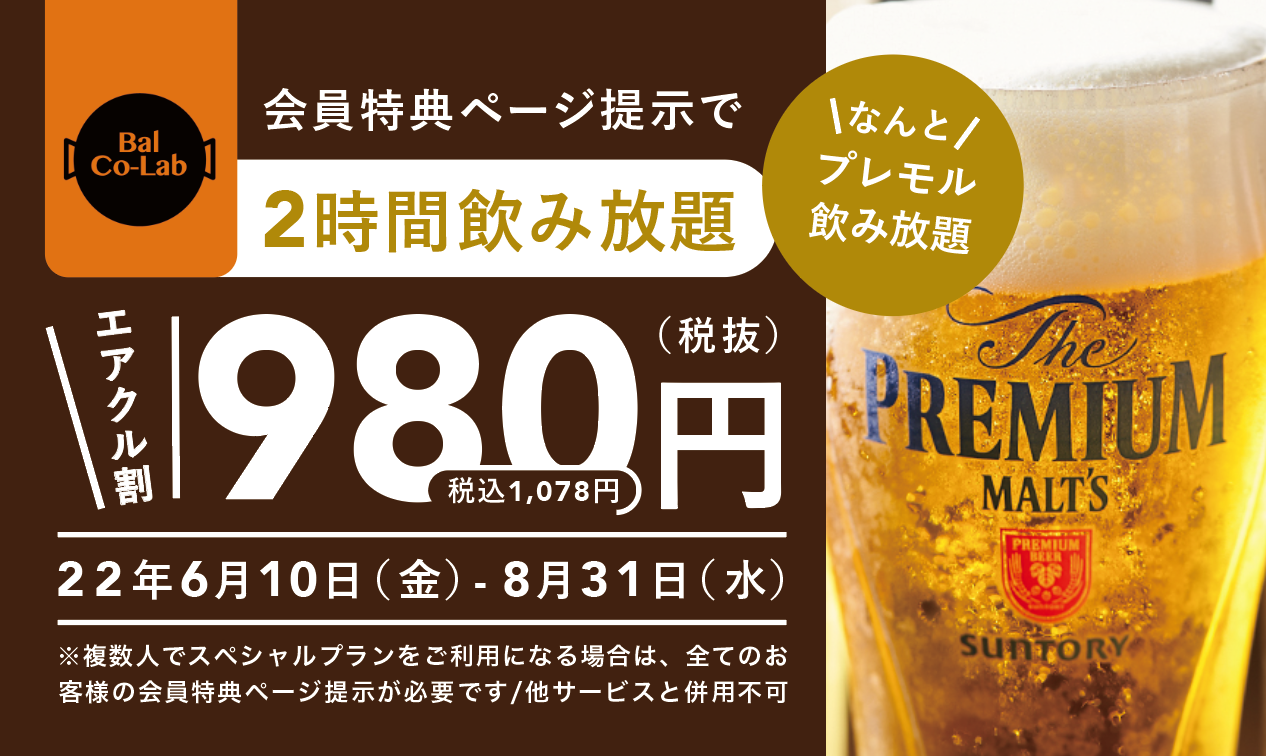 この度当社では、沖縄県内のエアクル利用者に向けて、琉球アスティーダ様が運営するバルコラボで使えるお得な会員特典を提供致します。キャンペーン期間中に対象店舗に来店し、アプリ内の「会員特典」画面を表示すると、通常2時間飲み放題1,628円(税込)のところを1,078円(税込)で割引特典を受けられます。期間中は何度でもご利用いただけるので、お得にお酒を楽しむことができるほか、運転代行を素早く呼び出し、安心してお帰り頂けます。